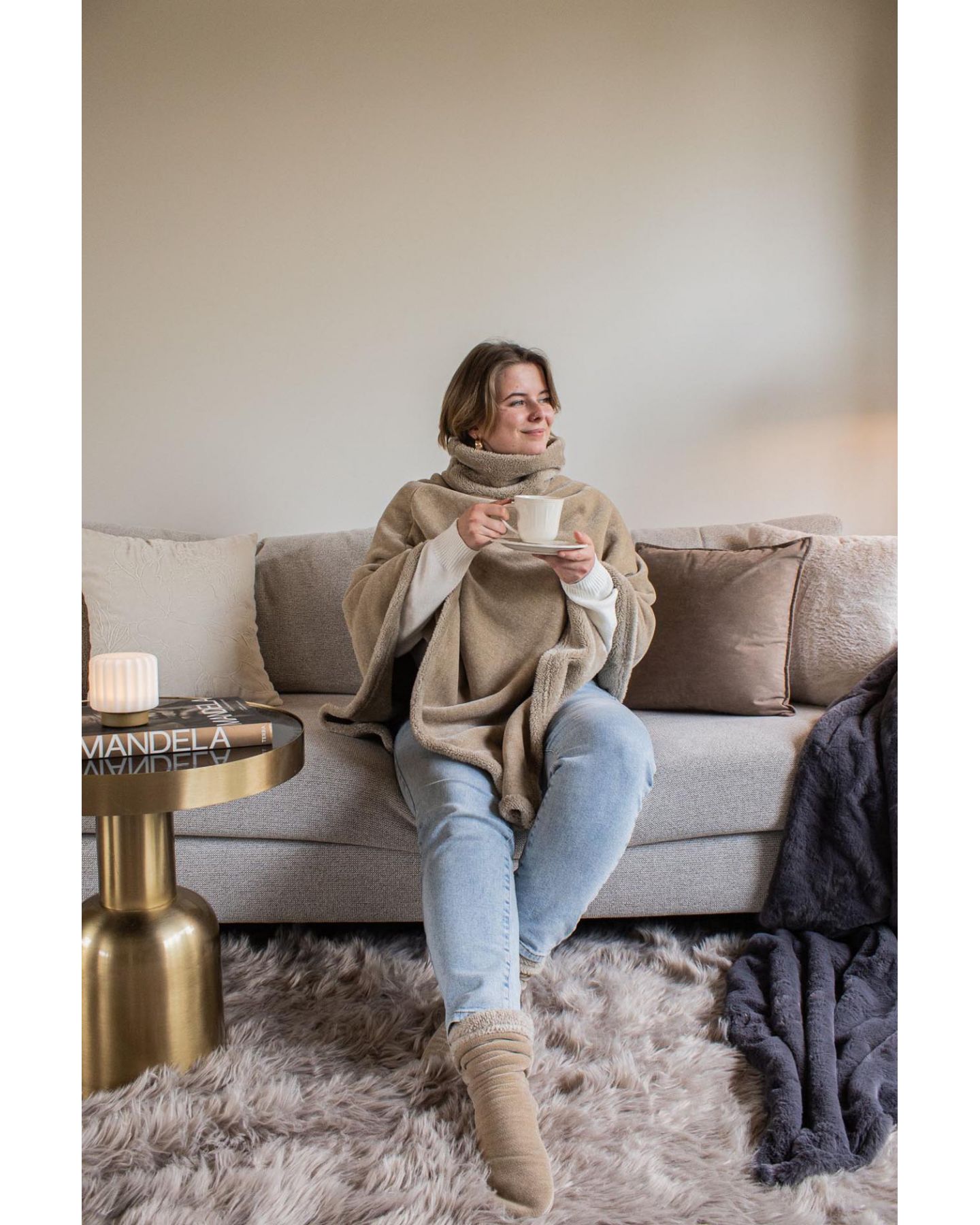Paire de chaussettes antidérapantes tout doux en 100% polyester à enfiler pour garder vos pieds au chaud et en grand confort grâce à sa doublure en fourrure douce et luxueuse. Taille unique. Avec le poncho assorti, c'est le cadeau idéal pour un cocooning parfait !