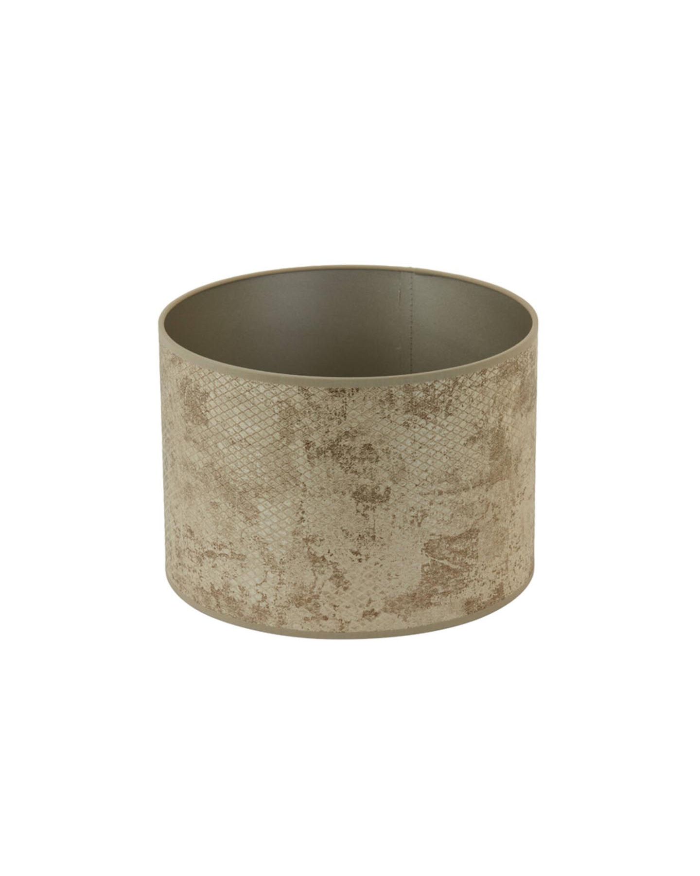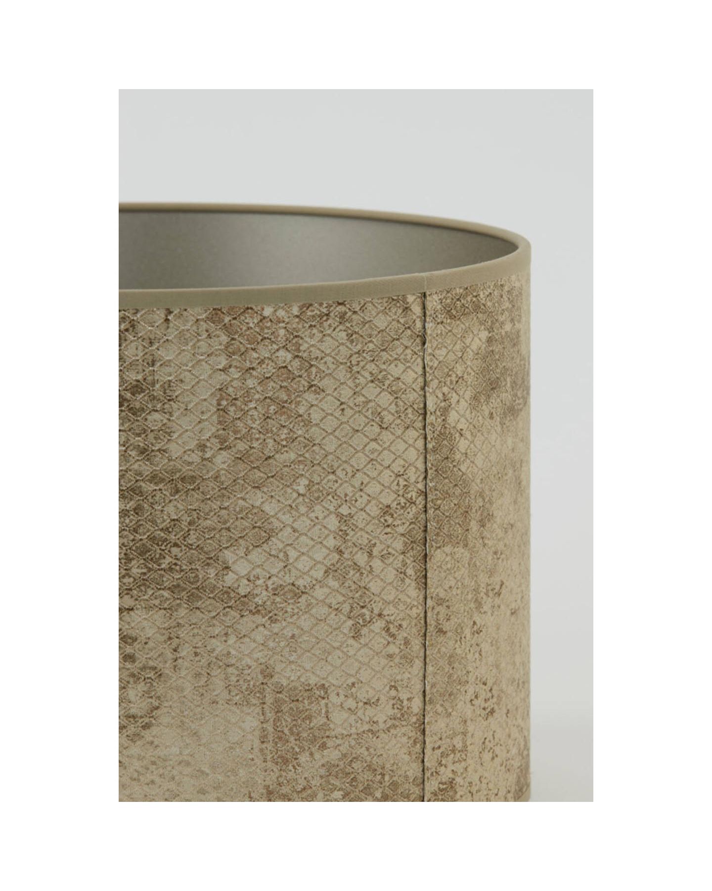 Abat-jour cylindre en textile marron clair aux motifs de peaux de faune sauvage. Pied de lampe et ampoule à votre disposition sur notre site.