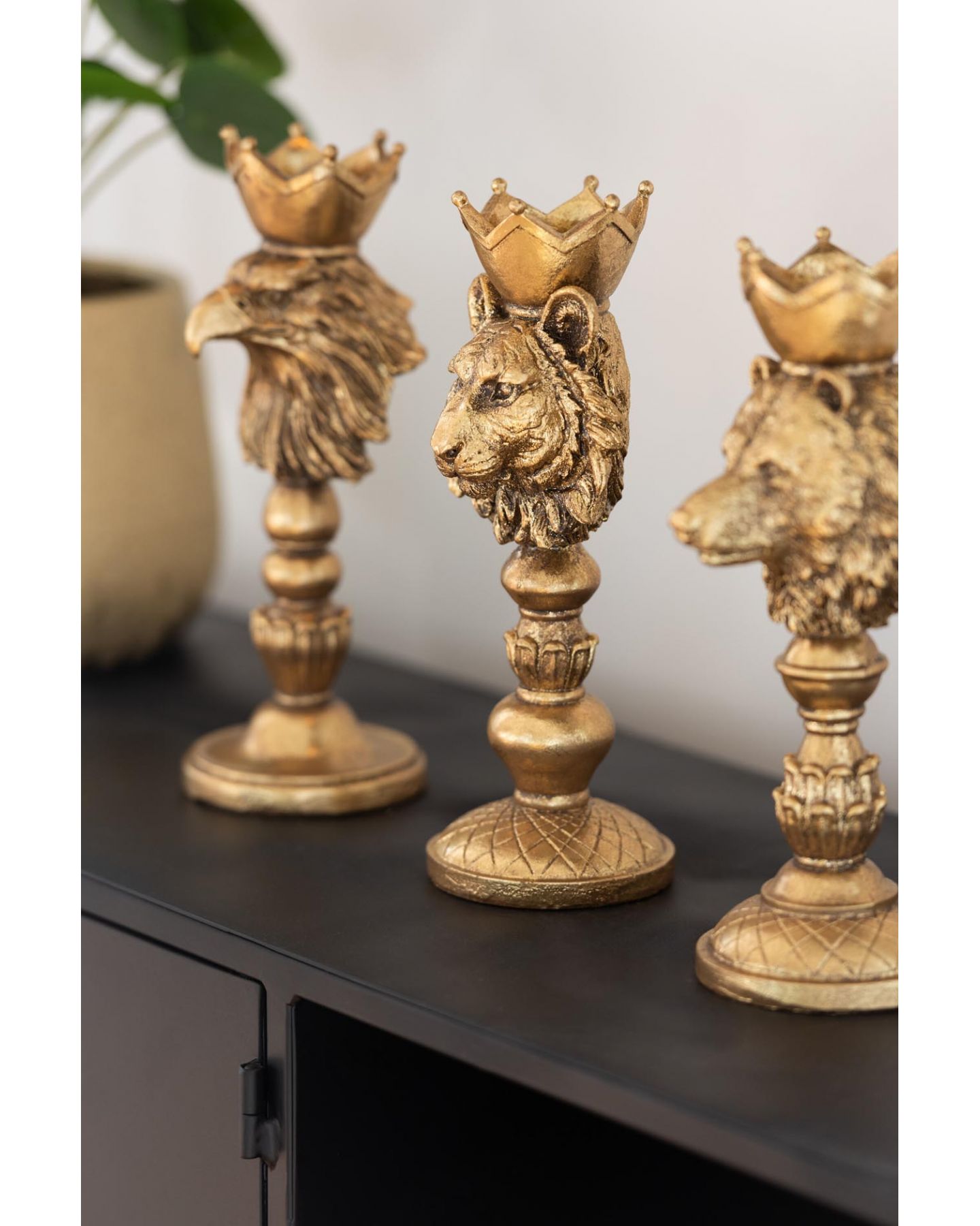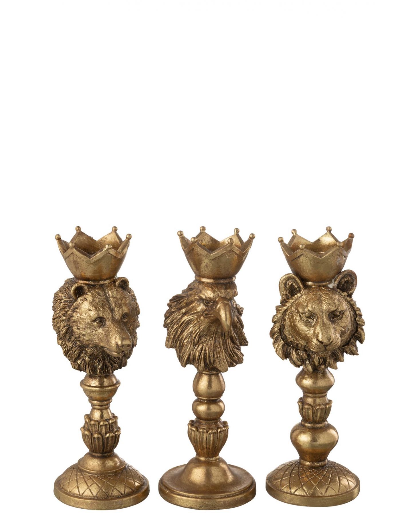 Bougeoir en résine de haute qualité doré antique orné d'une tête d'animal couronné. Classique et élégant, à compléter avec des bougies disponible en magasin et dans la catégorie Bougie et Diffuseur. Dessin au choix selon les stocks disponibles.