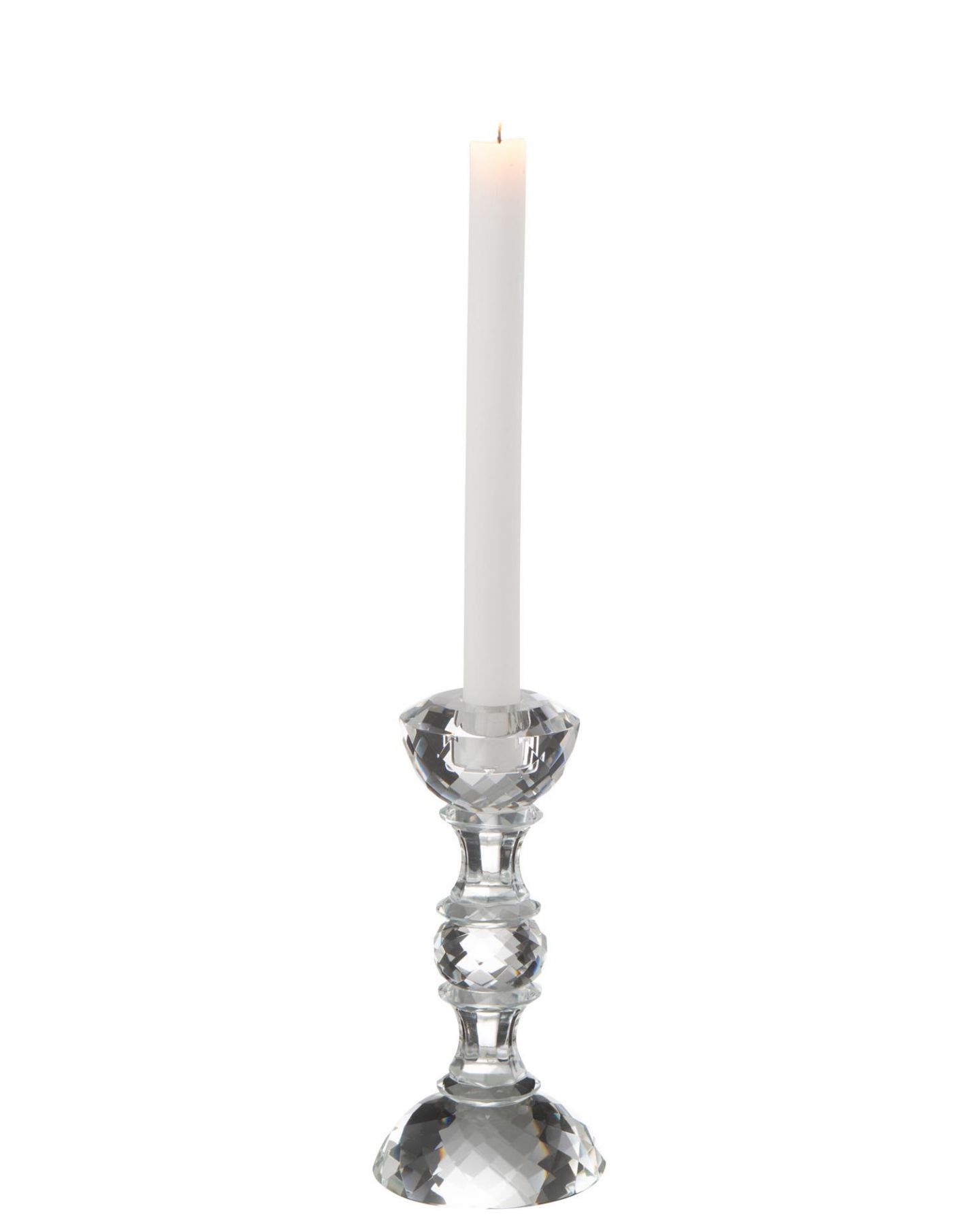Bougeoir en verre taillé transparent, d'un style classique et élégant. A compléter avec une bougie chandelle disponible en magasin et dans la catégorie Bougie et Diffuseur.