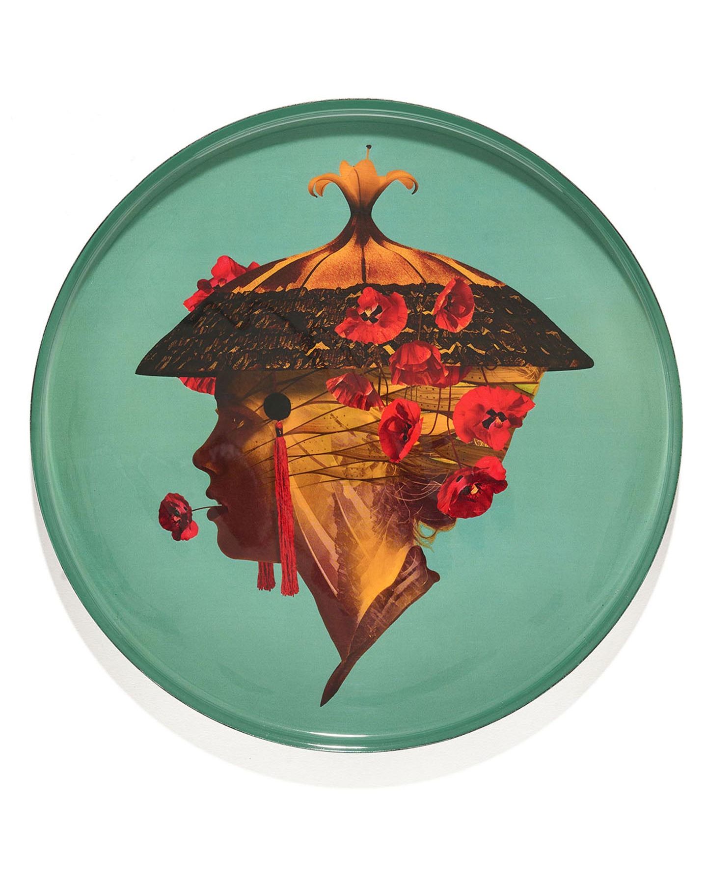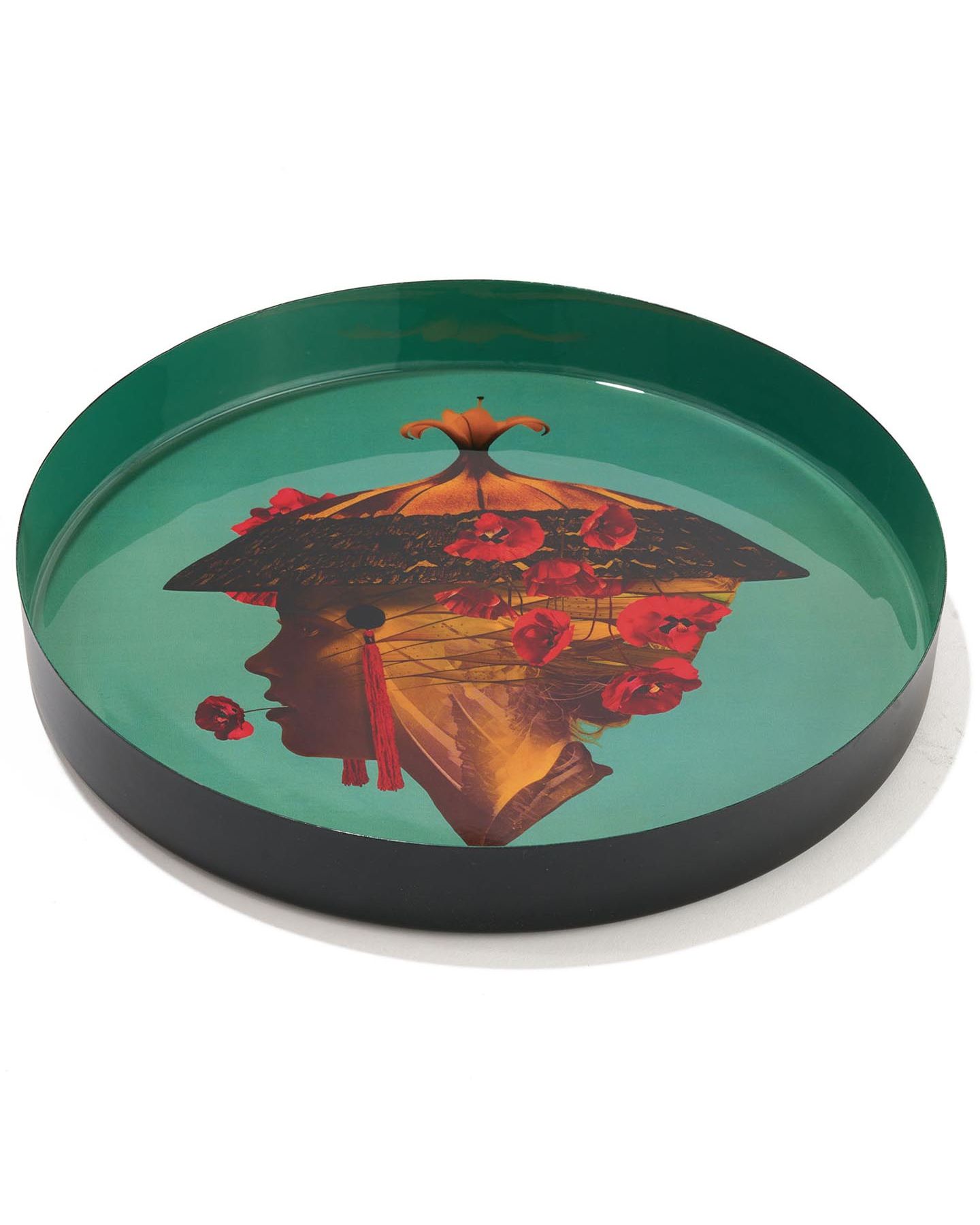 Plateau rond décoratif en fer avec son intérieur verni et imprimé, fabriqué à la main. D'un style contemporain, ce magnifique plateau sert à l'heure apéritif ou à disposer comme objet de décoration.