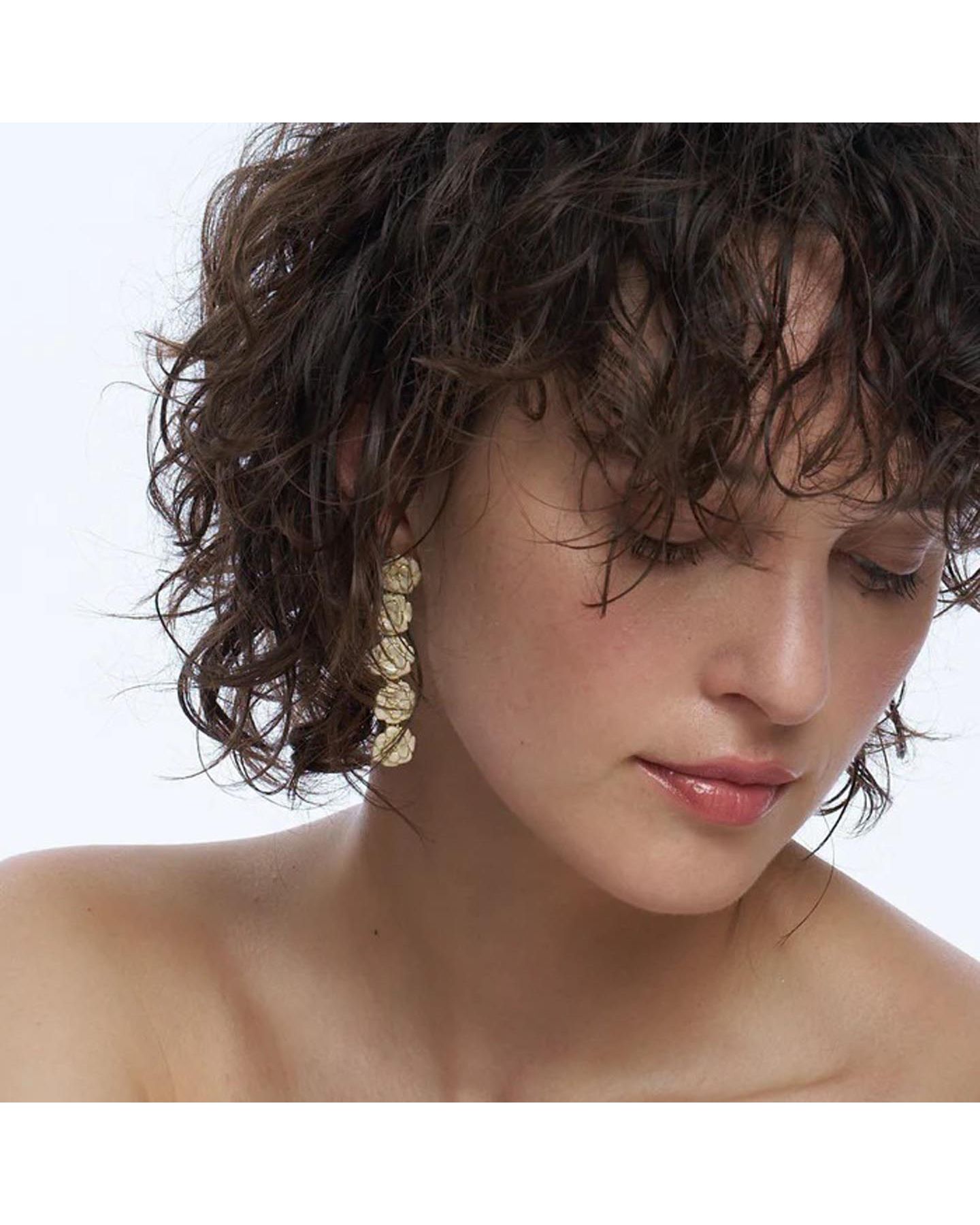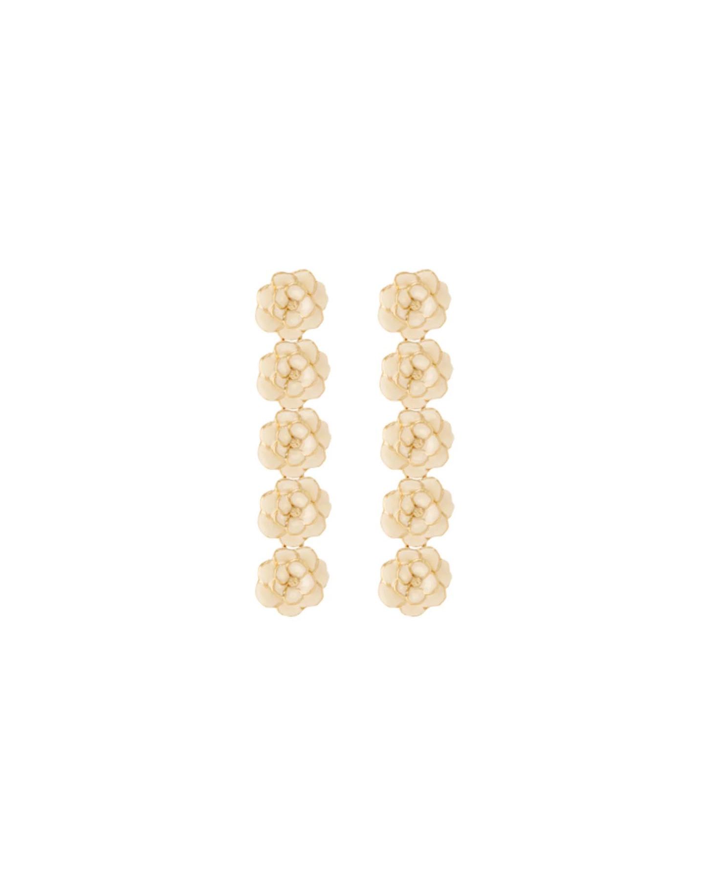 Boucles d'oreilles pendantes en acier doré orné d'une tombée de pivoines en laiton doré à l'or fin et émail blanc sable pour un style chic et élégant. Forme pendante, ces boucles d'oreilles magnifiques ont une tige en acier chirurgical et ne comportent aucune substance allergène. A porter tous les jours pour sublimer toutes vos tenues sans hésitation !