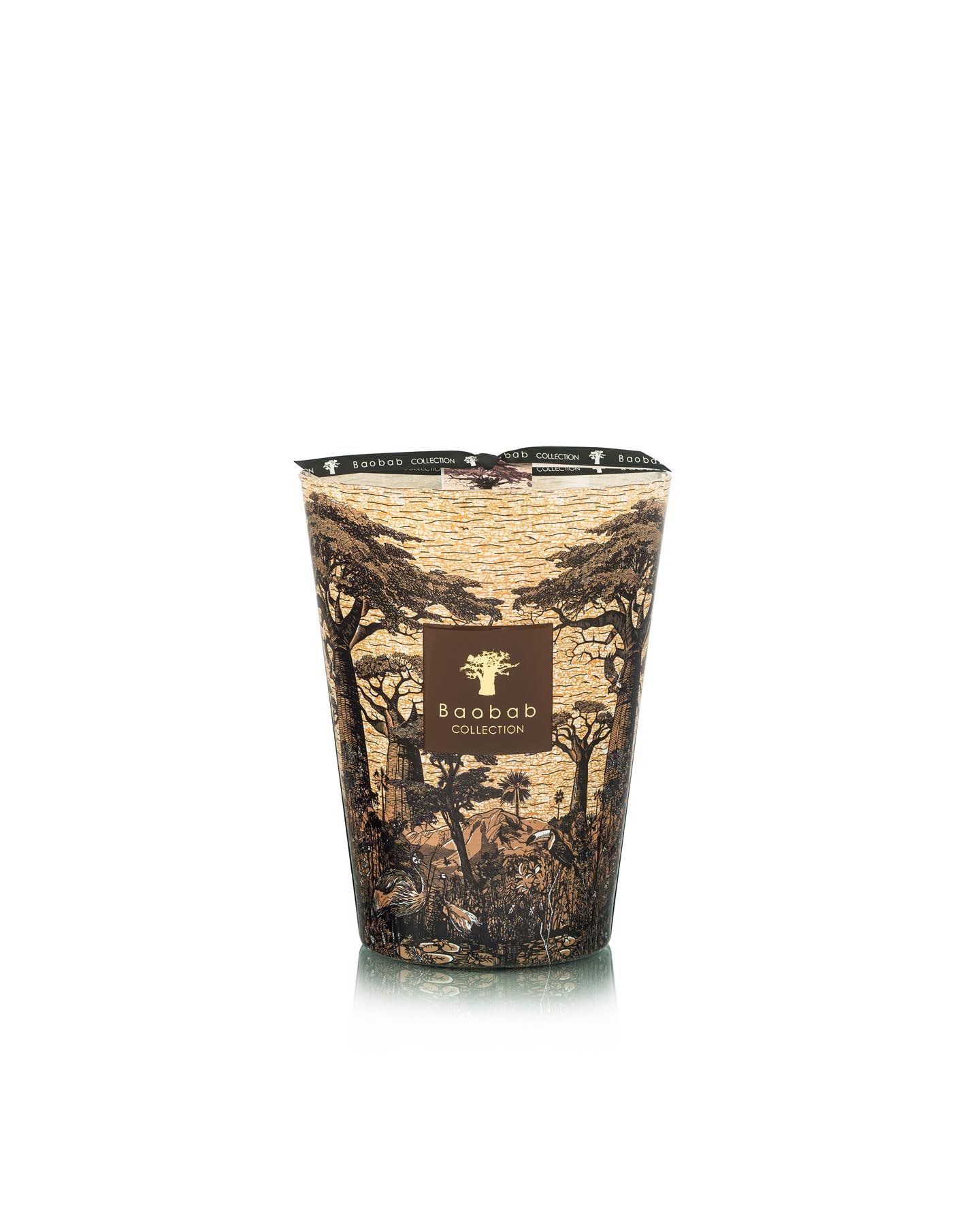 Bougie parfumée en cire d'une grande qualité fabriquée à la main dans les ateliers Baobab en Europe. Avec cinq mèches en coton égyptien, cette bougie parfumée est versée à la main dans une vase en verre soufflé bouche avec un dessin unique.