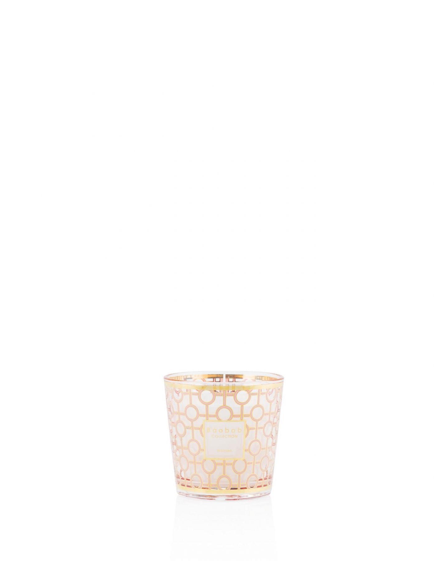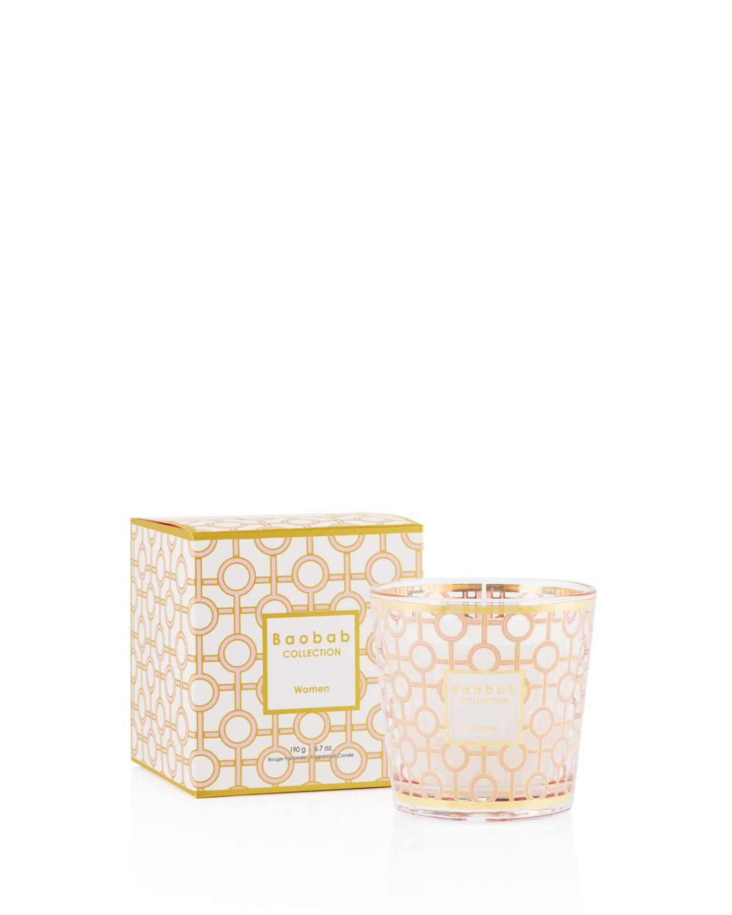 La bougie parfumée Women est réalisée dans un verre au décor sérigraphie d’or et de rose poudré.