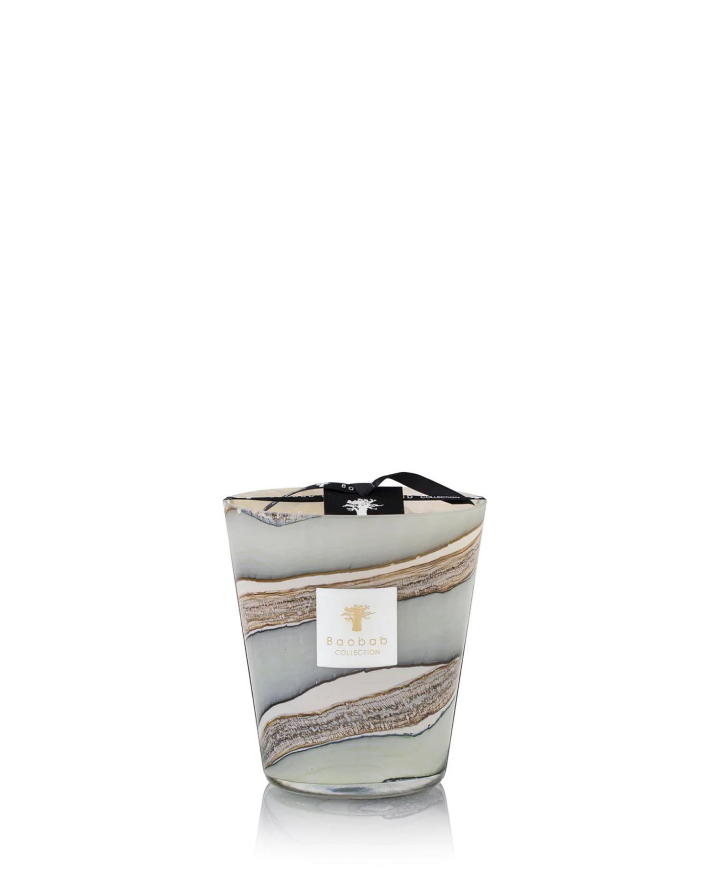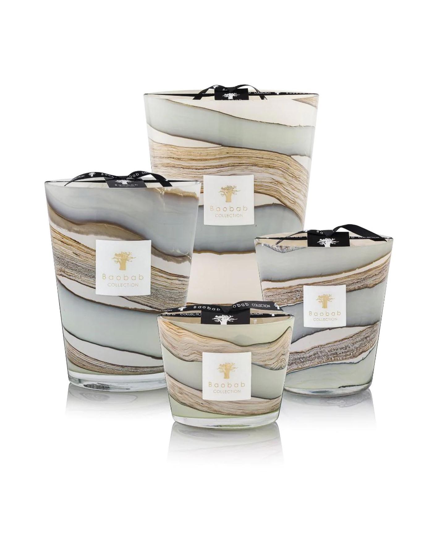 La bougie parfumée Sonora à quatre mèches s’incarne dans un verre soufflé bouche extrêmement sophistiqué. Les couleurs formant des lignes aléatoires sur le verre sont une explosion de tons raffinés allant du vert céladon aux camaïeux de bleu gris.