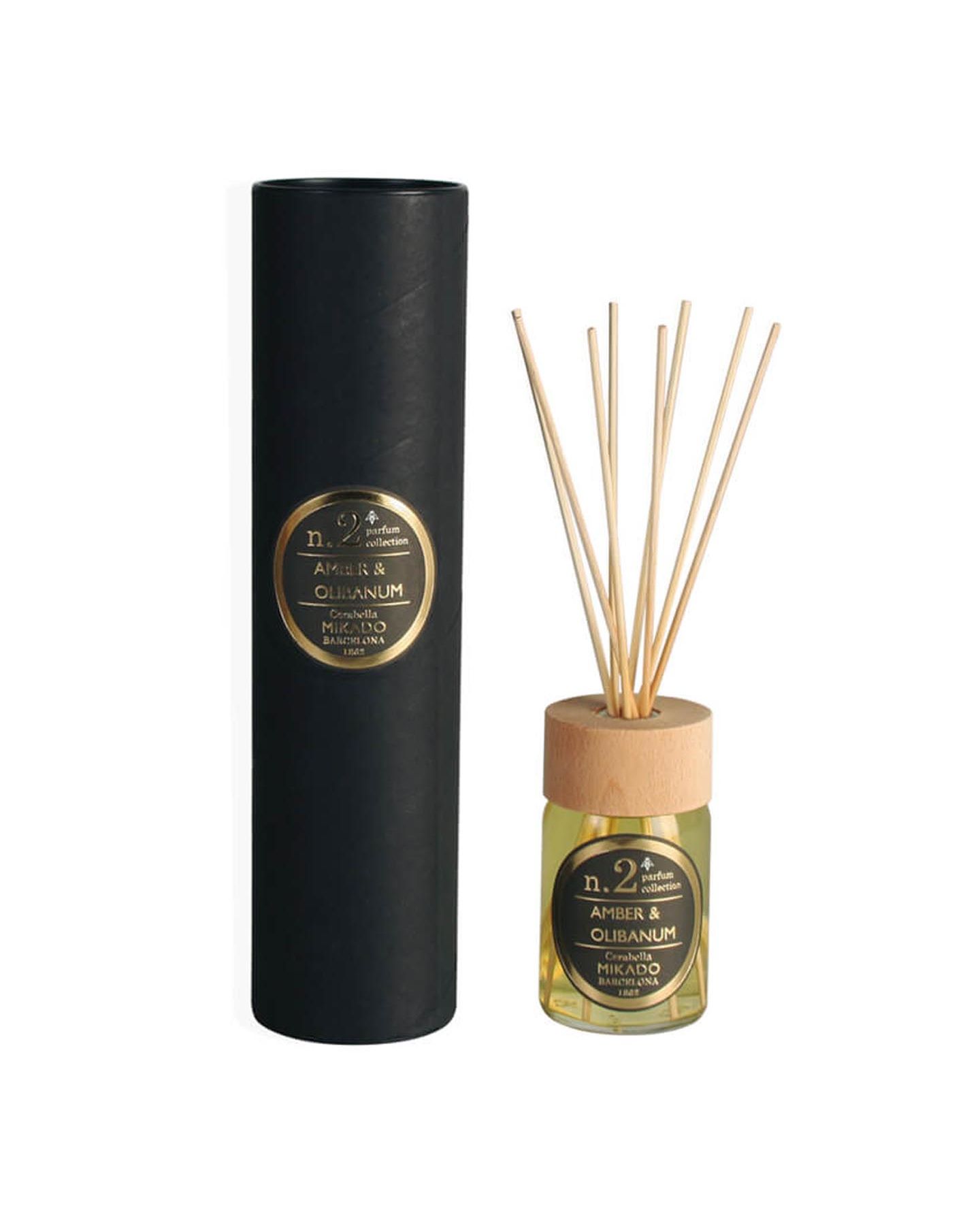 Diffuseur de parfum d'ambiance de 100 ml dans un flacon en verre avec un couvercle en bois et 8 tiges de rotin. Découvrez notre nouvelle collection de parfums d'ambiance, dont chaque numéro correspond à un parfum raffiné et élégant, d'une fabrication artisanale à Barcelone, en Espagne. Le cadeau idéal !