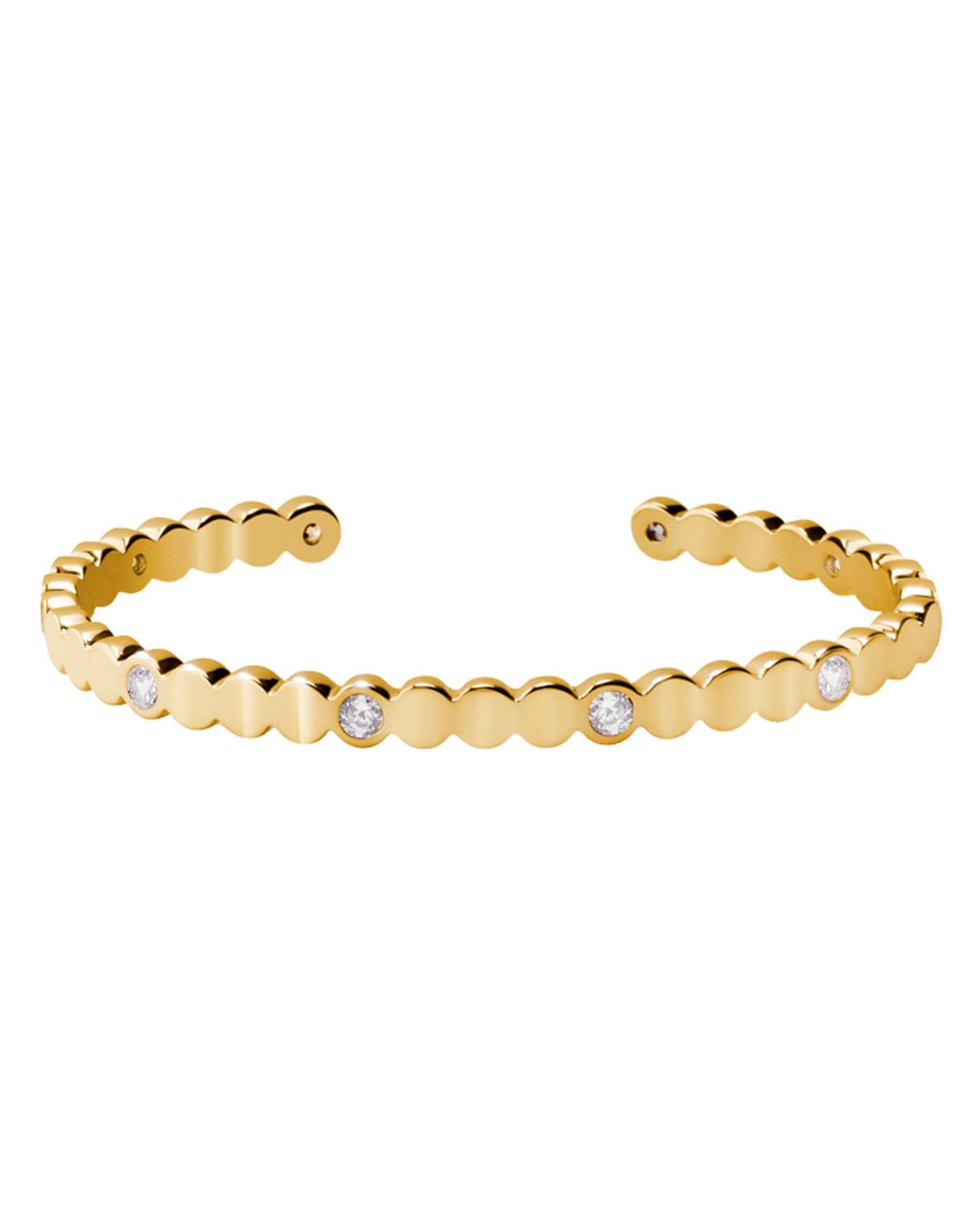 Bracelet jonc fin en laiton trempé dans un bain d’or fin 0,5 microns et serti d'oxydes de zirconium pour un style discret et élégant. Forme semi-ouverte et souple, ce bracelet jonc s’ajuste aux poignets de toutes tailles en serrant ou desserrant avec une légère pression.