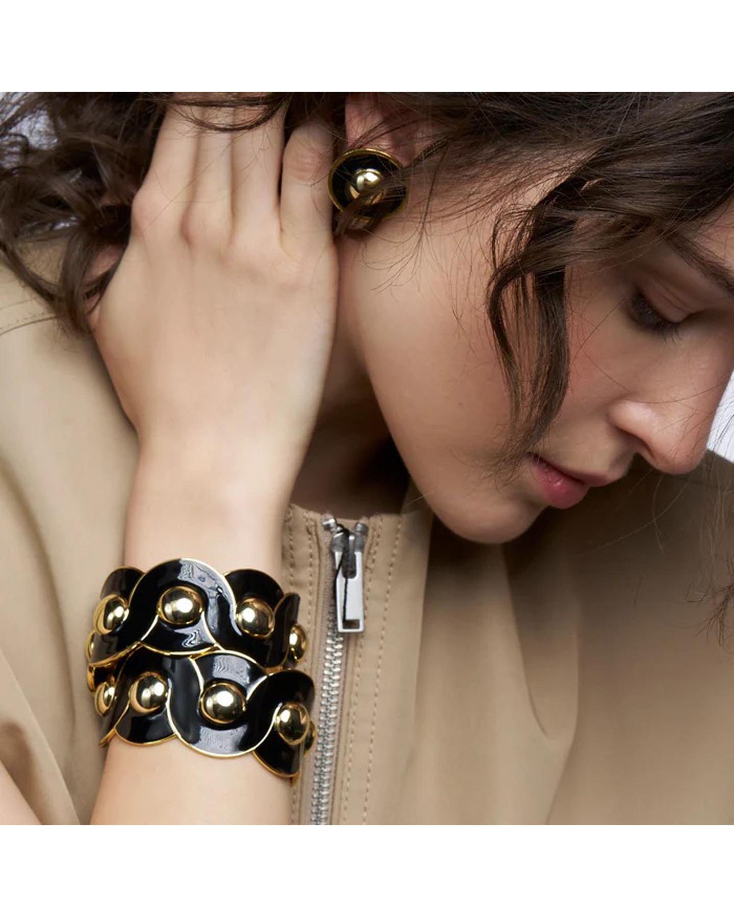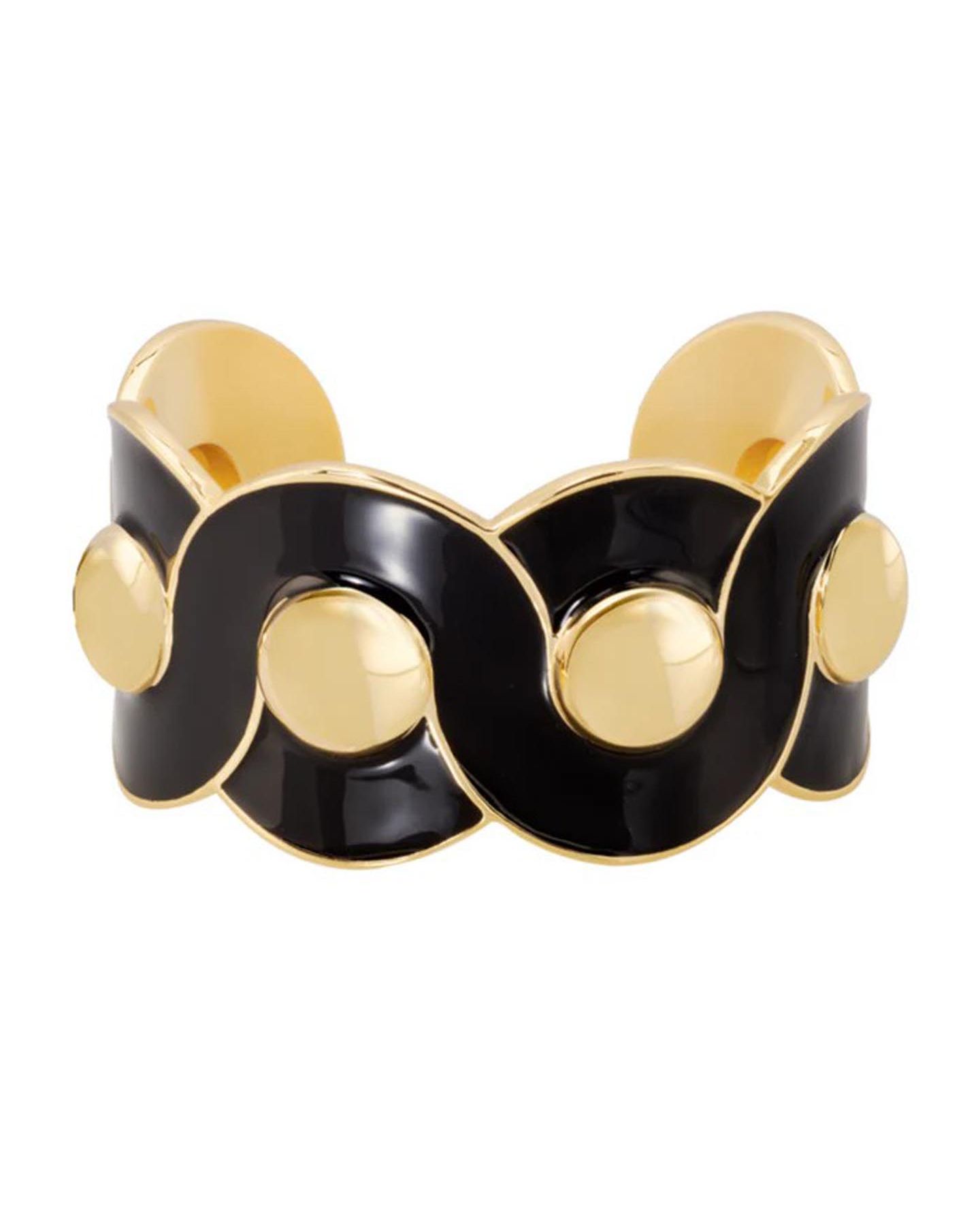 Manchette magnifique en laiton trempé dans un bain d’or fin et et orné des sphères entourées des vagues d'émail noir pour un style chic et contemporain. Forme semi-ouverte, ce bracelet s’ajuste aux poignets de toutes tailles en serrant ou desserrant avec une légère pression.