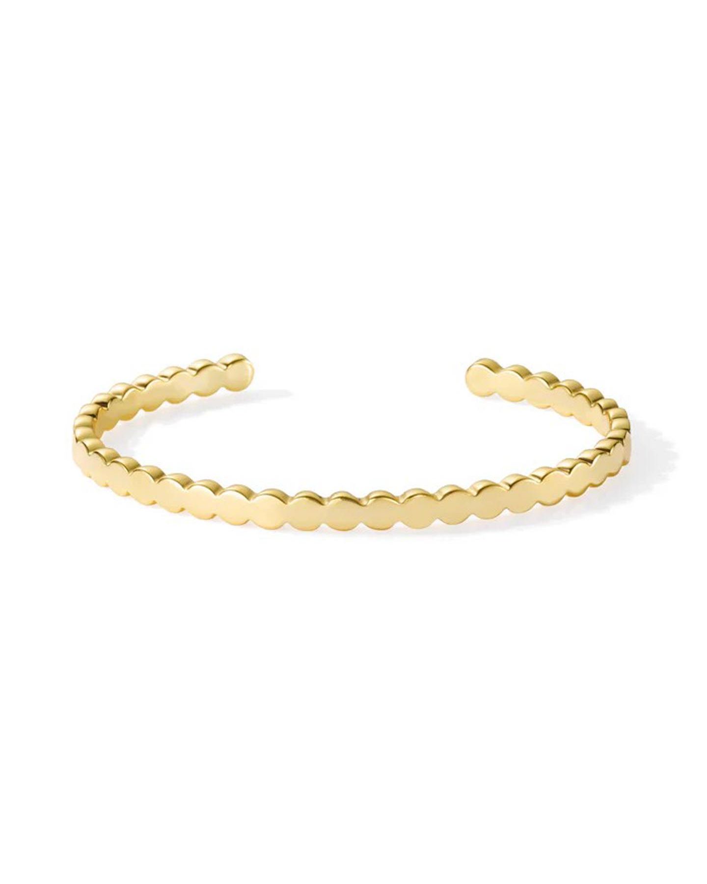 Bracelet jonc fin en laiton trempé dans un bain d’or fin, orné des points pour un style discret et élégant. Forme semi-ouverte et souple, ce bracelet jonc s’ajuste aux poignets de toutes tailles en serrant ou desserrant avec une légère pression.