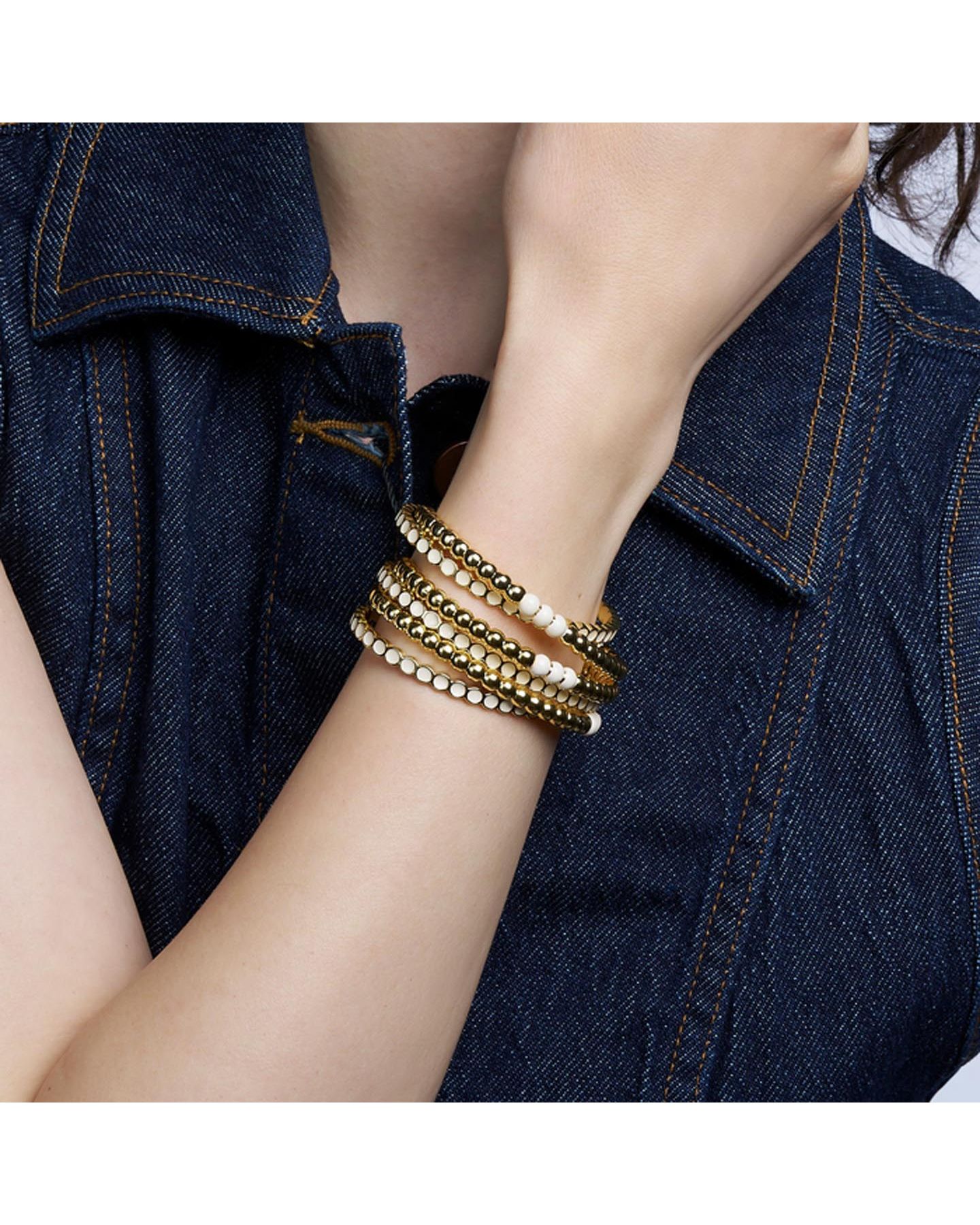 Bracelet jonc fin en laiton trempé dans un bain d’or fin, orné des perles dorées dont deux émaillées blanc sable pour un style discret et élégant. Forme semi-ouverte et souple, ce bracelet jonc s’ajuste aux poignets de toutes tailles en serrant ou desserrant avec une légère pression.