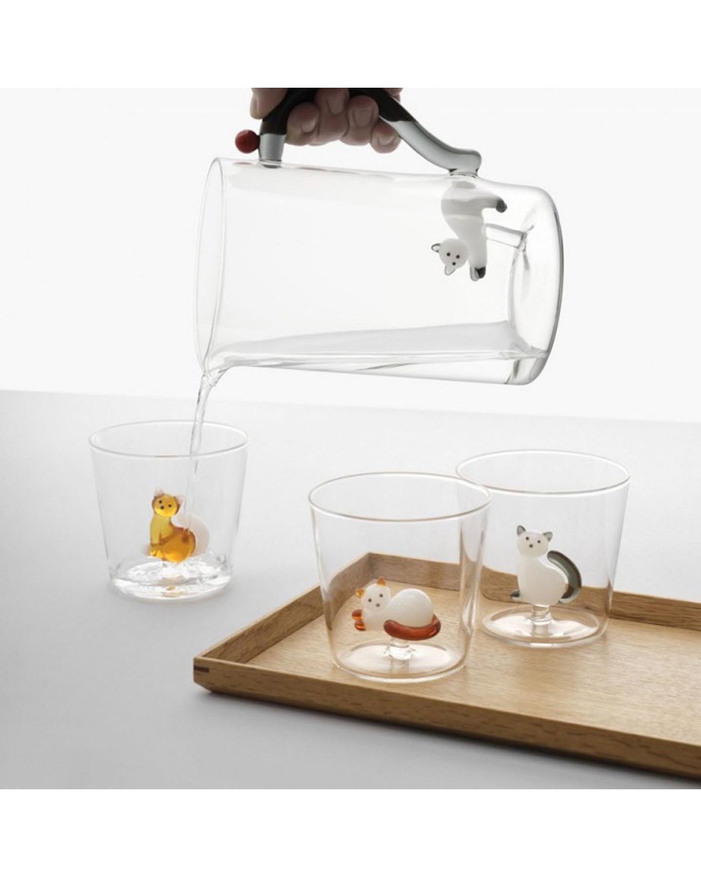 Une carafe en verre borosilicaté transparent avec un chat à l'intérieur dont la queue fait la poignée, faisant partie d'une série très originale élaborée à Milan. Cette carafe, fabriqué à la main de façon artisanale avec un travail à la flamme, apportera une touche unique à votre table. A associer avec d'autres articles de la série disponible en magasin ou sur notre site dans la catégorie Art de la Table pour faire le cadeau idéal ! Passe au lave-vaisselle à basse température (40° recommandé).