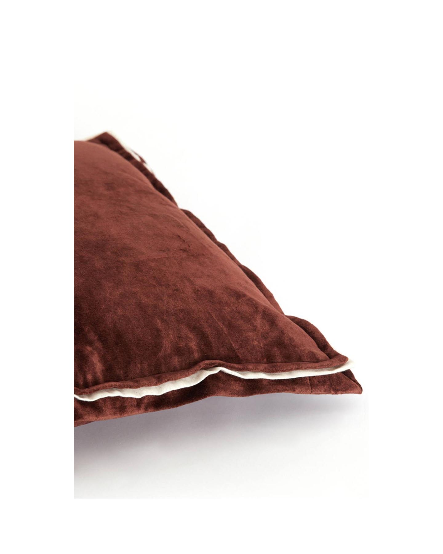 Coussin garni en velours marron foncé avec une bordure intégrée en lin naturel pour un style contemporain. Le rembourrage de ce coussin est de 100% polyester. Avec une housse amovible, ce coussin apportera une touche de douceur aux couleurs tendances à votre intérieur.