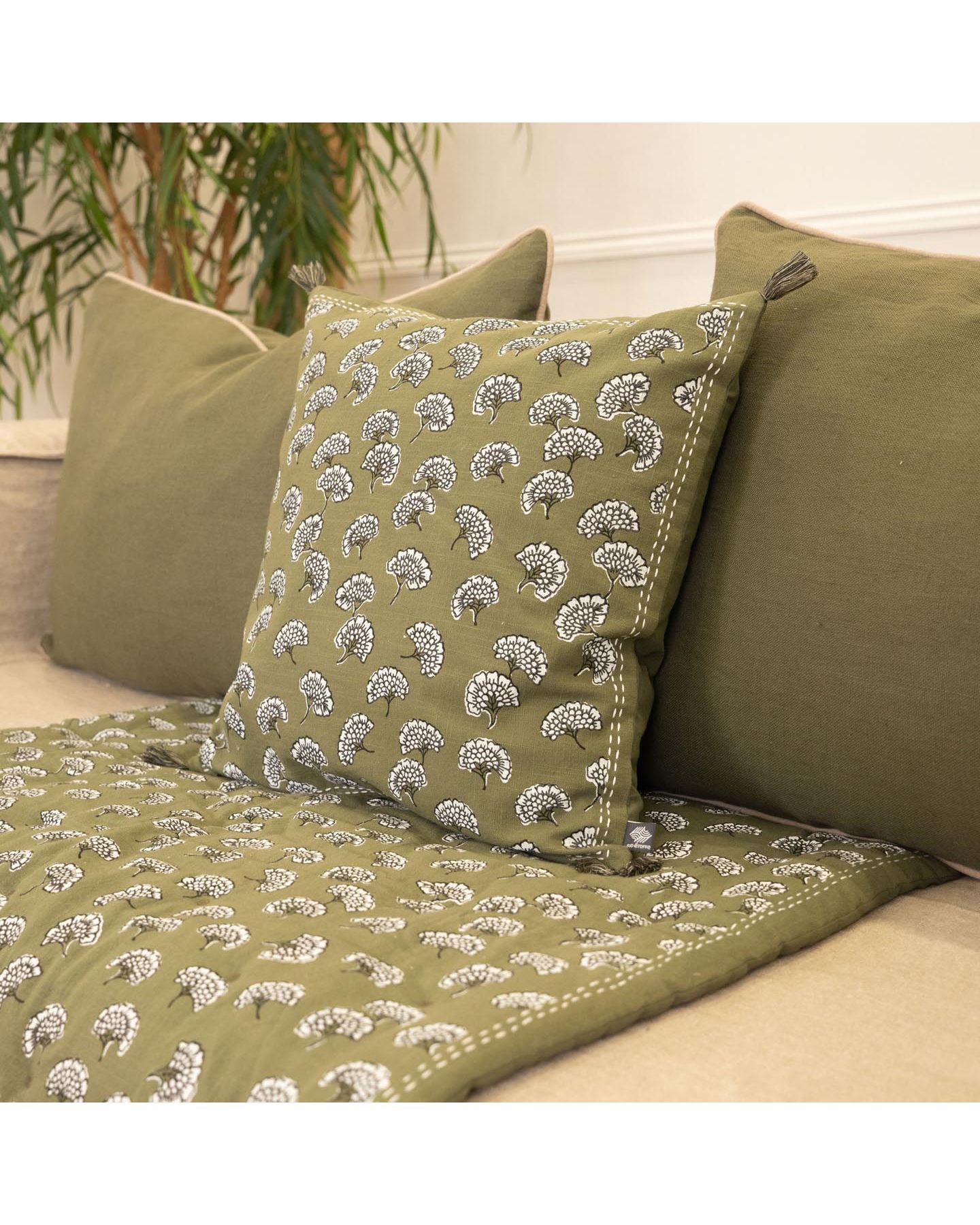 Coussin garni carré en coton kaki, imprimés des motifs naturels avec une finition pompons, housse amovible en 100% coton, remplissage 100% polyester, à apporter une touche de style à vos meubles.