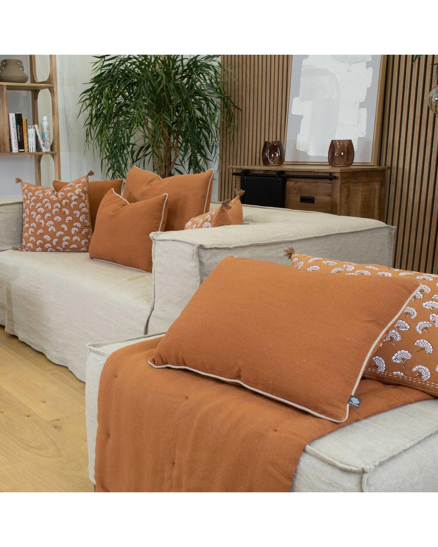 Coussin garni rectangulaire avec une face en lin lavé brun uni et l'autre en coton bordé d'une lisière complémentaire, housse amovible en 100% coton, remplissage 100% polyester, à apporter une touche de style à vos meubles.