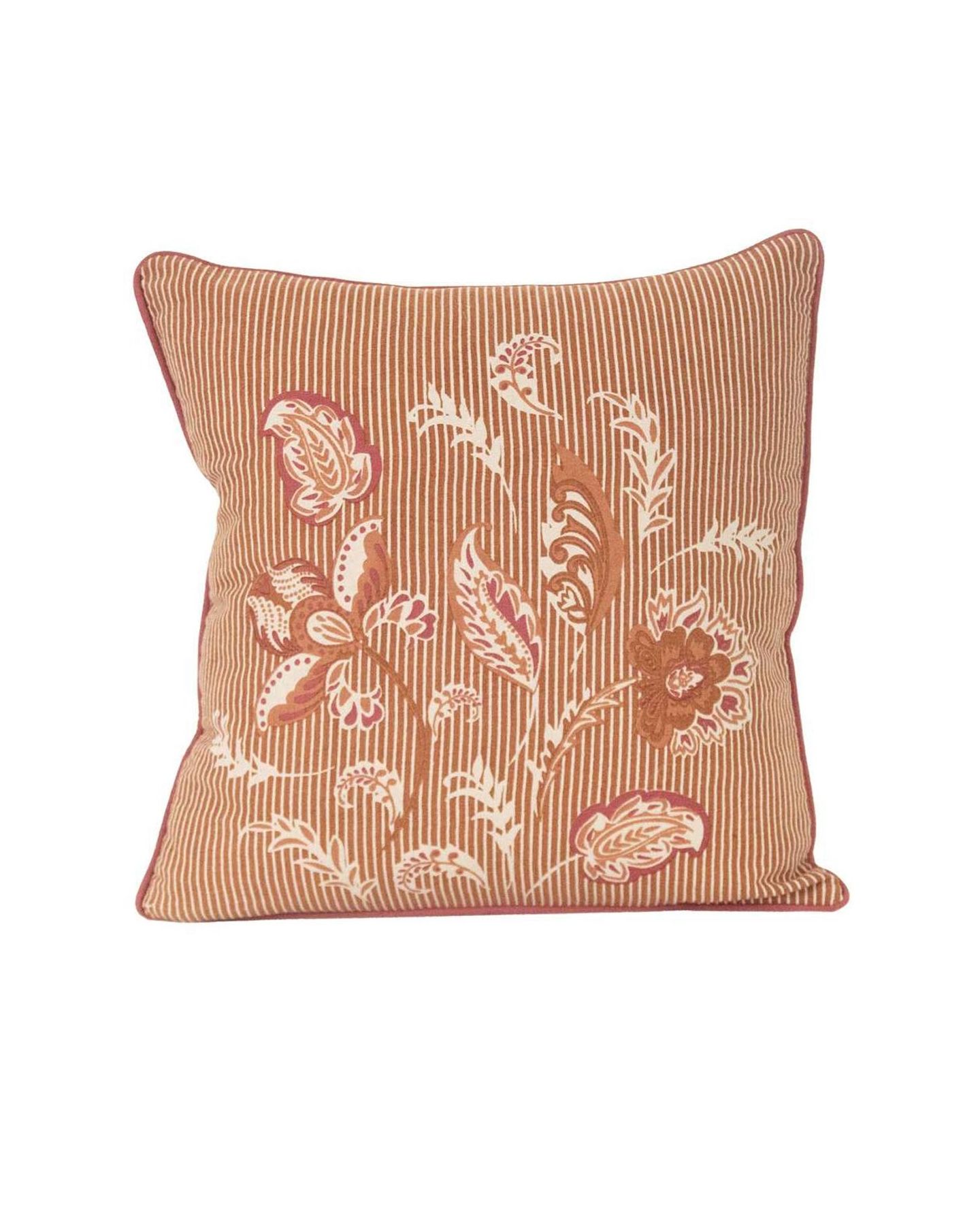 Coussin garni carré en coton et polyester aux rayures fines et imprimé des motifs indiens riches et colorés. Les motifs reflètent l'art typique du sud de l'Inde et apporteront de la chaleur et caractère à vos meubles. Housse est amovible avec une finition passepoil et remplissage 100% polyester.