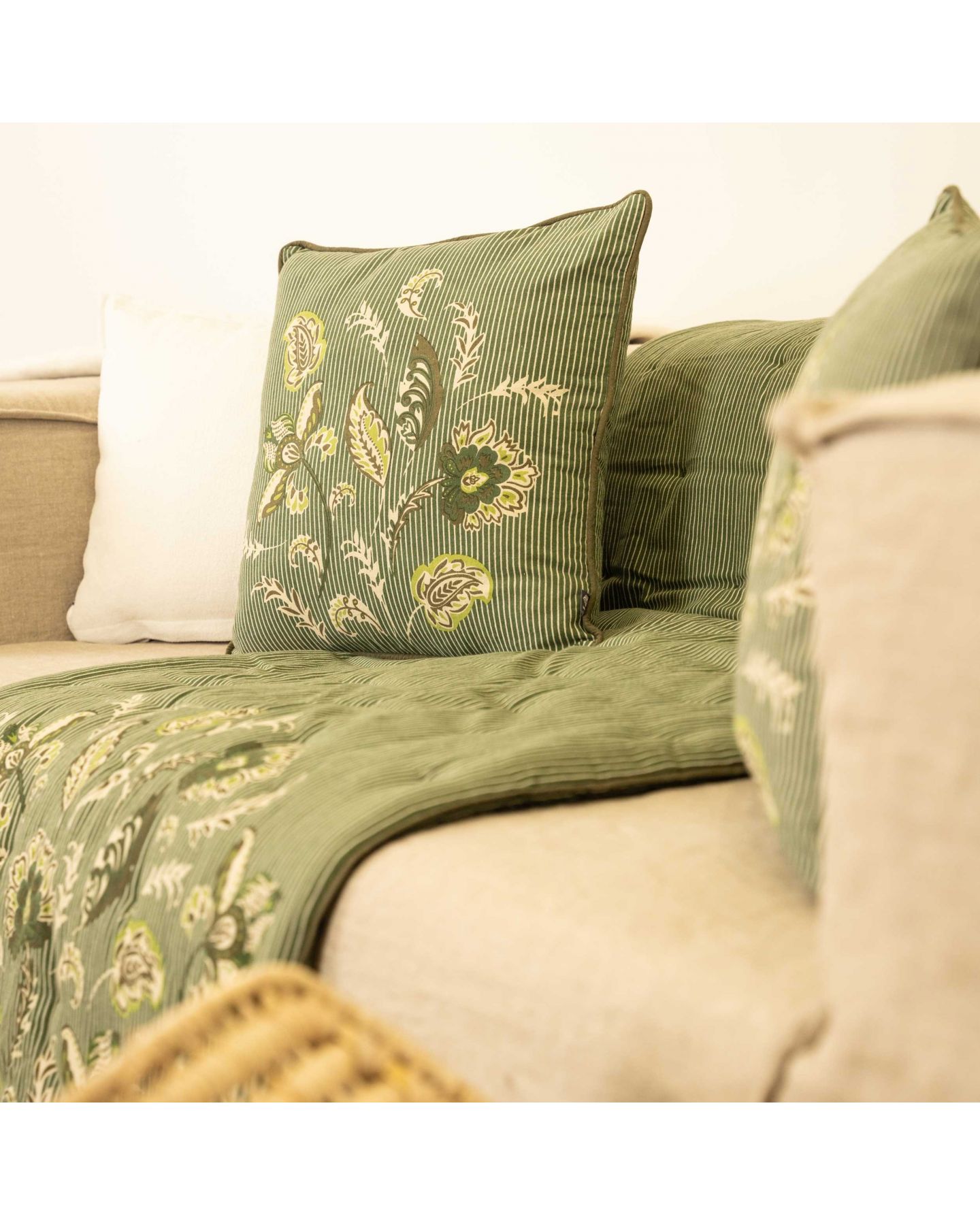 Coussin garni carré en coton et polyester aux rayures fines et imprimé des motifs indiens riches et colorés. Les motifs reflètent l'art typique du sud de l'Inde et apporteront de la chaleur et caractère à vos meubles. Housse est amovible avec une finition passepoil et remplissage 100% polyester.