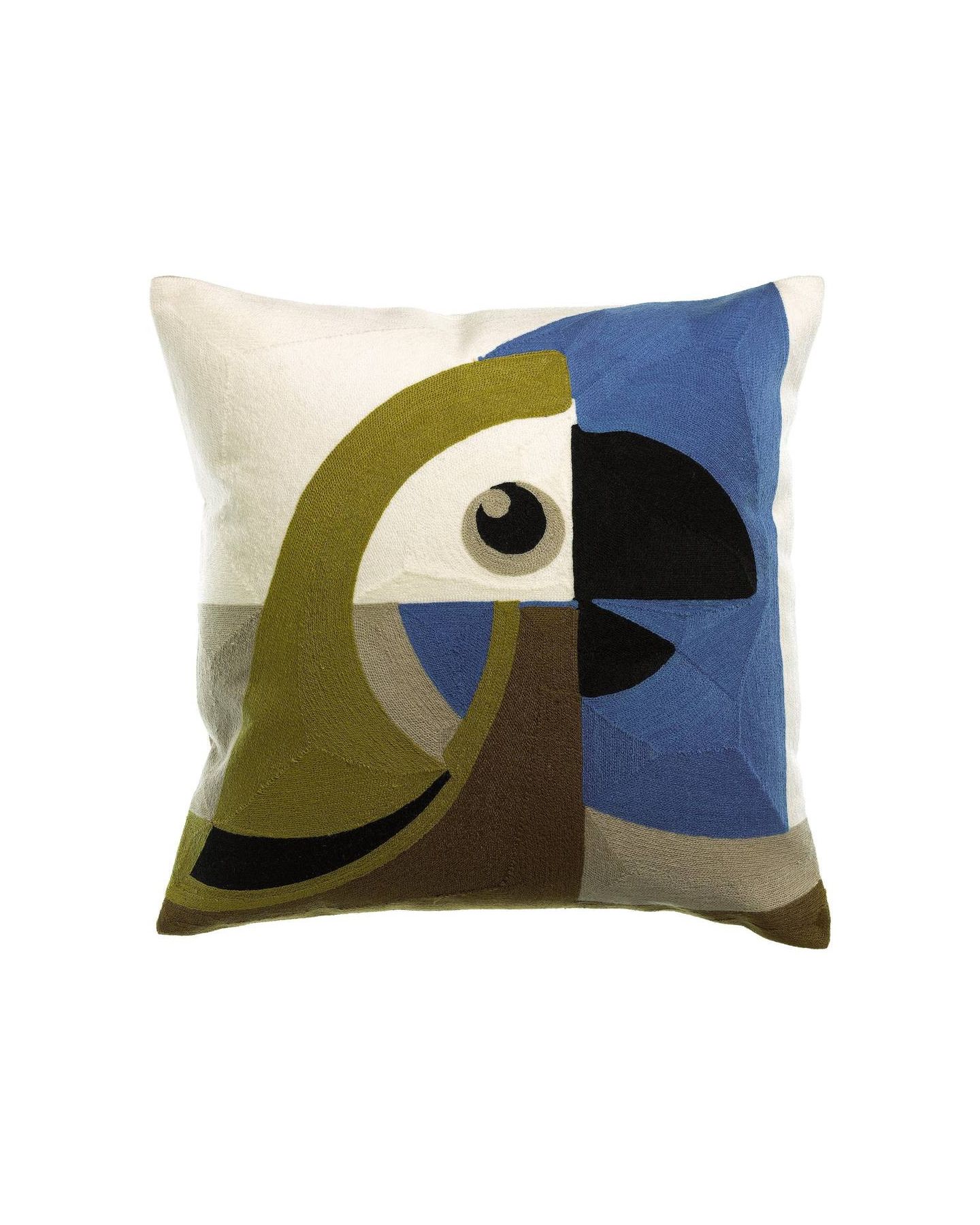 Ce coussin garni met en scène un perroquet stylisé, travaillé comme une illustration graphique aux formes géométriques, brodés avec relief. Le dessin et les couleurs contrastées créent un effet décoratif original, parfait pour égayer et affirmer le style de votre intérieur. Confectionné en 100 % coton avec des finitions soignées et un garnissage 100% polyester. Sa broderie artisanale, réalisée à la main, confère à chaque coussin une histoire unique et un charme inimitable. Le verso en chambray ajoute une touche de douceur et d’élégance, complétant ce véritable chef-d’œuvre textile. Parfait pour sublimer votre intérieur, ce coussin apporte une note d’originalité et de raffinement qui ne manquera pas de captiver les regards.