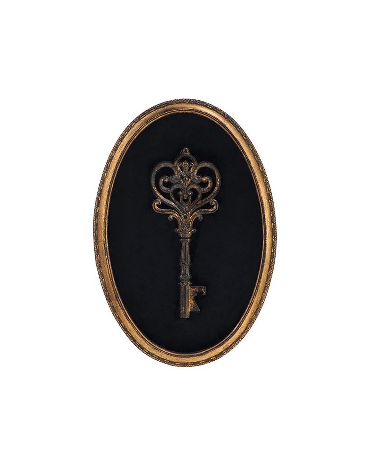 Élégante décoration murale formée d'un cadre ovale doré antique ornée d'une clé ancienne montée sur un fond en velours noir pour apporter une touche originale à votre intérieur. Attaches au dos pour fixation murale. A assortir avec d'autres décorations murales disponible en magasin et sur notre site.