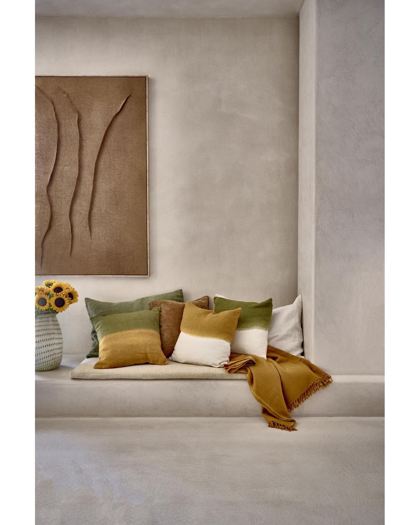 Toile en jute naturel encadrée en bois et ornée des lignes douces ondulées en relief ne manquera pas de relever un mur clair avec ses teintes calmes et harmonieuses.