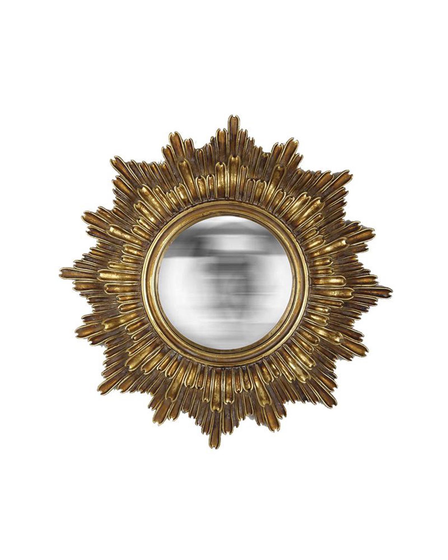 Miroir rond convexe doré antique en forme soleil en relief. Attaches au dos pour fixation murale. A assortir avec d'autres décorations murales disponible en magasin et sur notre site.