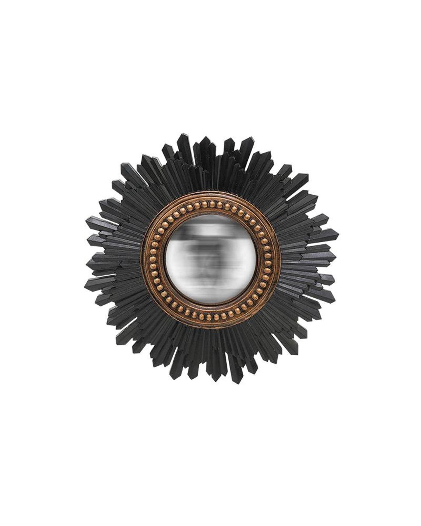 Miroir rond convexe noir et doré antique en forme soleil avec des rayons en relief. Attaches au dos pour fixation murale. A assortir avec d'autres décorations murales disponible en magasin et sur notre site.