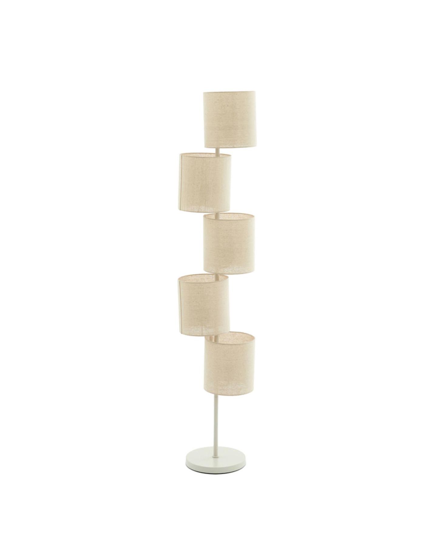 Lampadaire d'un style contemporain et original avec 5 abat-jours en tissu écru et un pied en métal beige mat. Avec son design élégant, cette lampadaire trouve sa place chez vous, ajoutant une note de sophistication à votre intérieur. Ampoule disponible en magasin et dans la catégorie accessoire de luminaire. Embout beige et cordon noir.