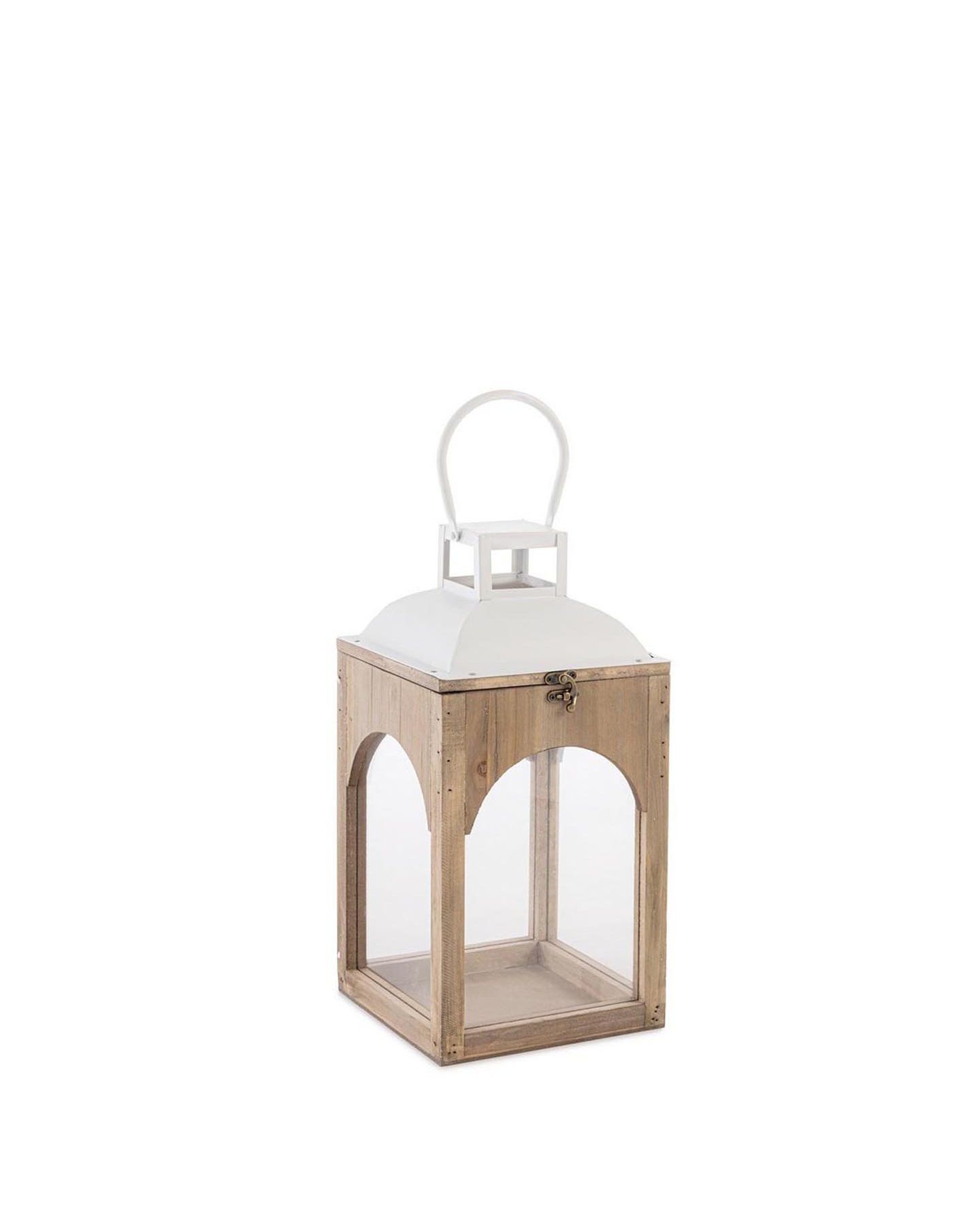 Lanterne en bois naturel et verre, forme carrée surmonté en métal banc avec une élégante poignée. Superbe photophore pour éclairer votre table. Habillez votre lanterne d'une bougie chauffe-plat ou d'une bougie classique disponible en magasin et dans la catégorie Bougie et Diffuseur.
