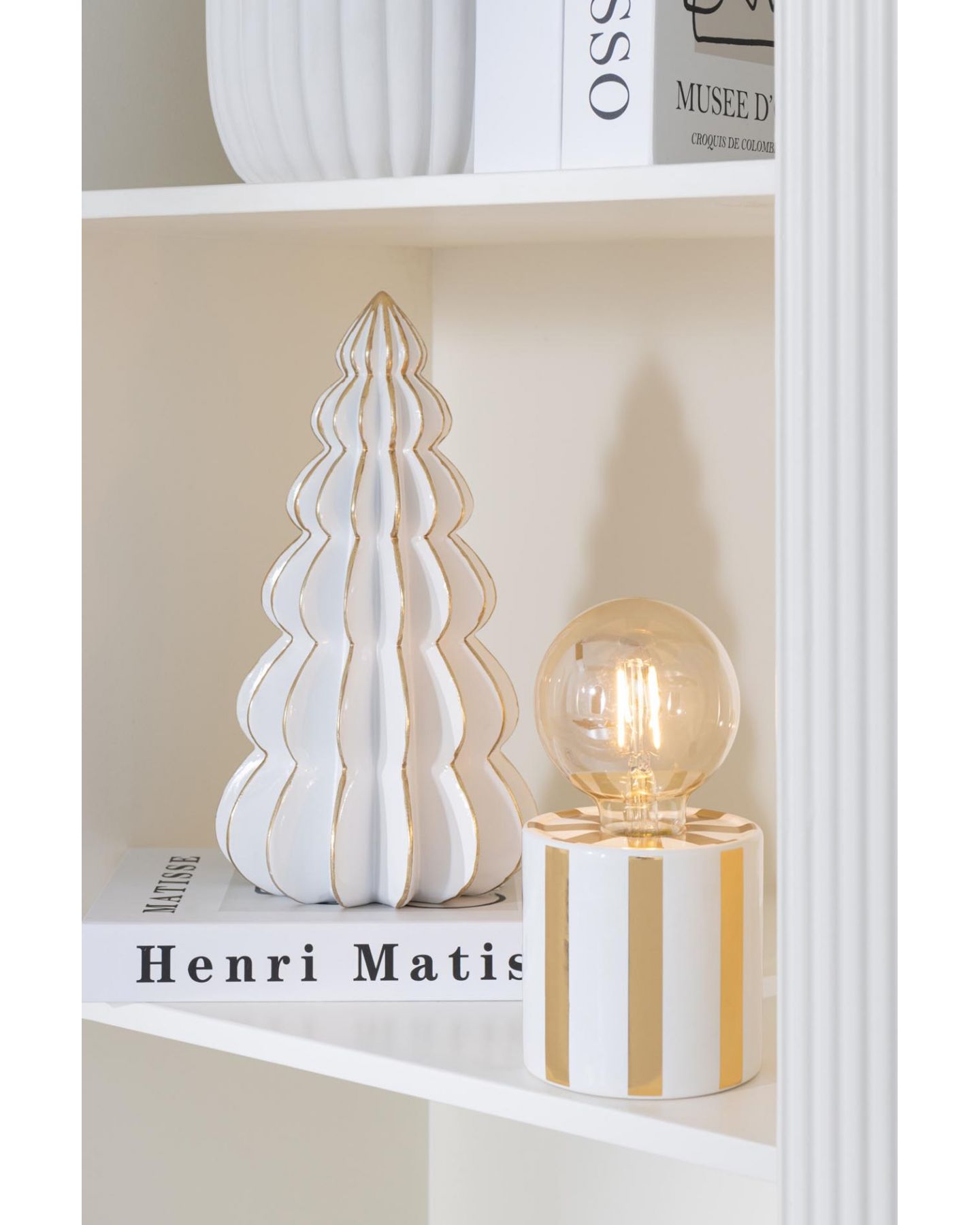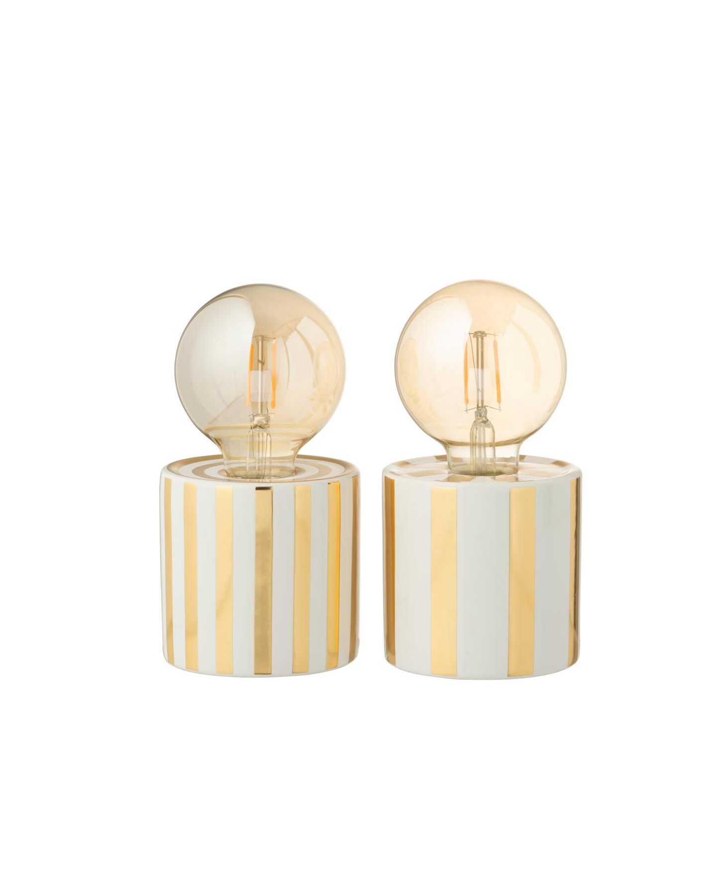 Petite lampe de table d'un style contemporain avec un abat-jour en forme d'ampoule doré et pied rond en ciment peint en blanc aux rayures dorées. Avec son design élégant, cette lampe s'intègre harmonieusement sur une table d'appoint, une étagère ou même comme lampe de chevet. Ampoule disponible en magasin et dans la catégorie accessoire de luminaire. Embout et cordon noir.