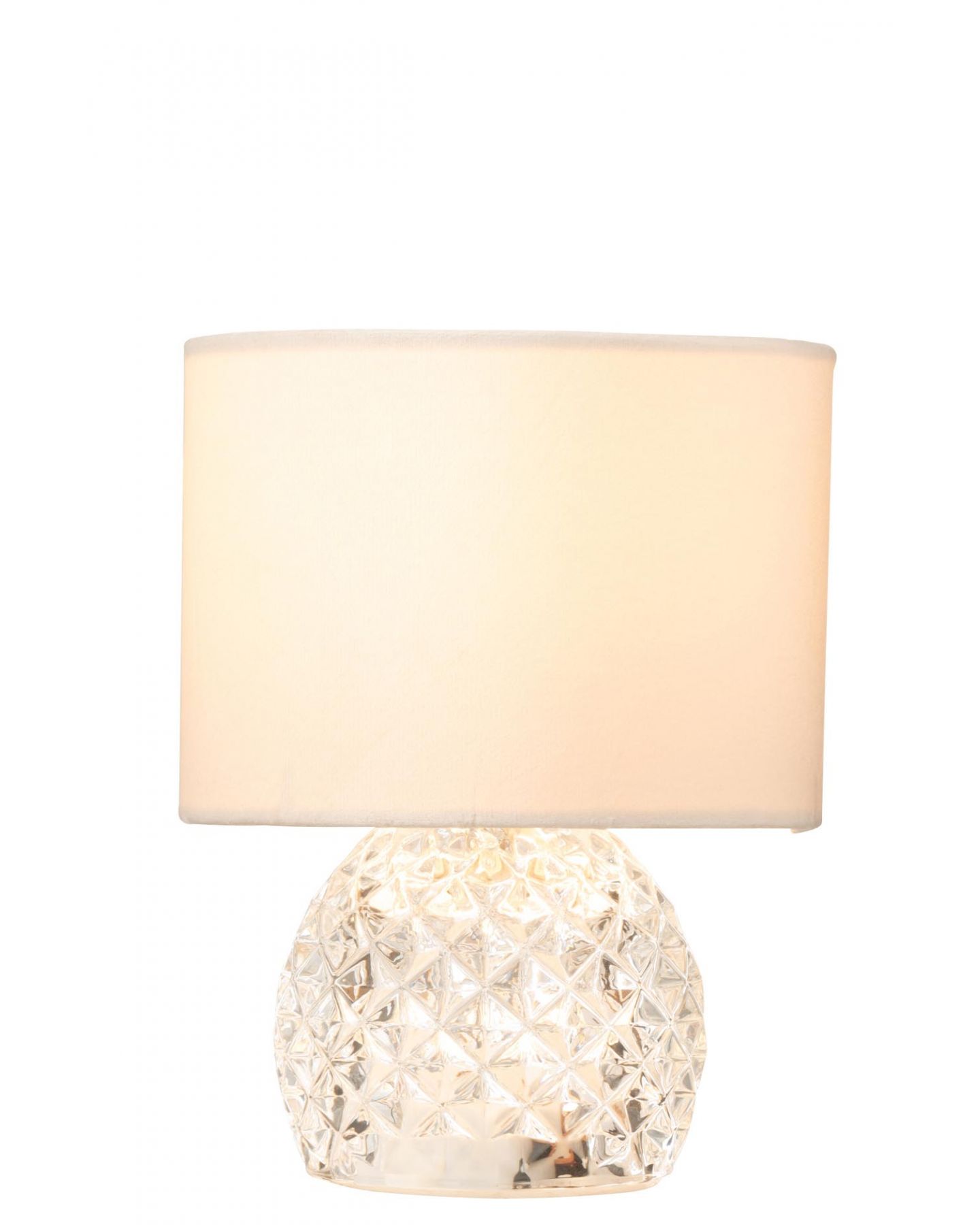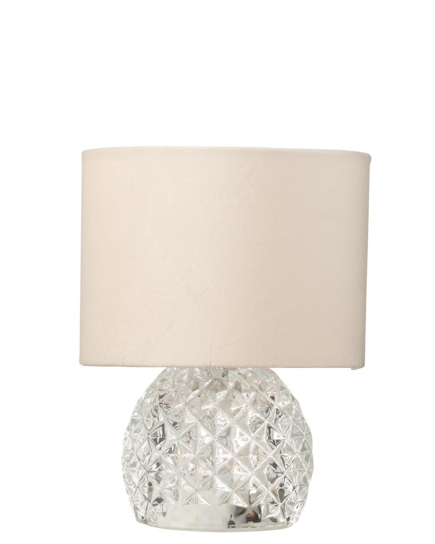 Magnifique lampe de table LED d'un style élégant avec un abat-jour en velours blanc cassé et pied en verre taillé transparent pour une diffusion douce de la lumière. Alimentation à piles. Ampoule disponible en magasin et dans la catégorie accessoire de luminaire.