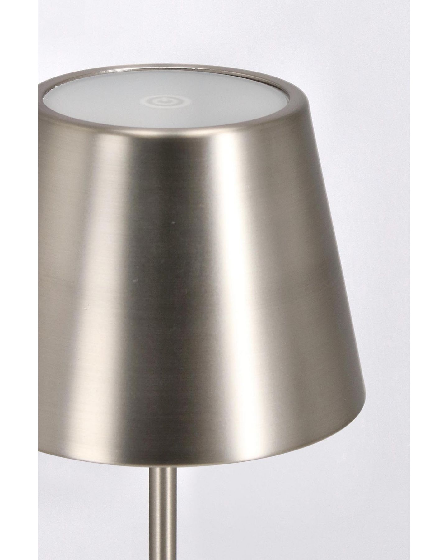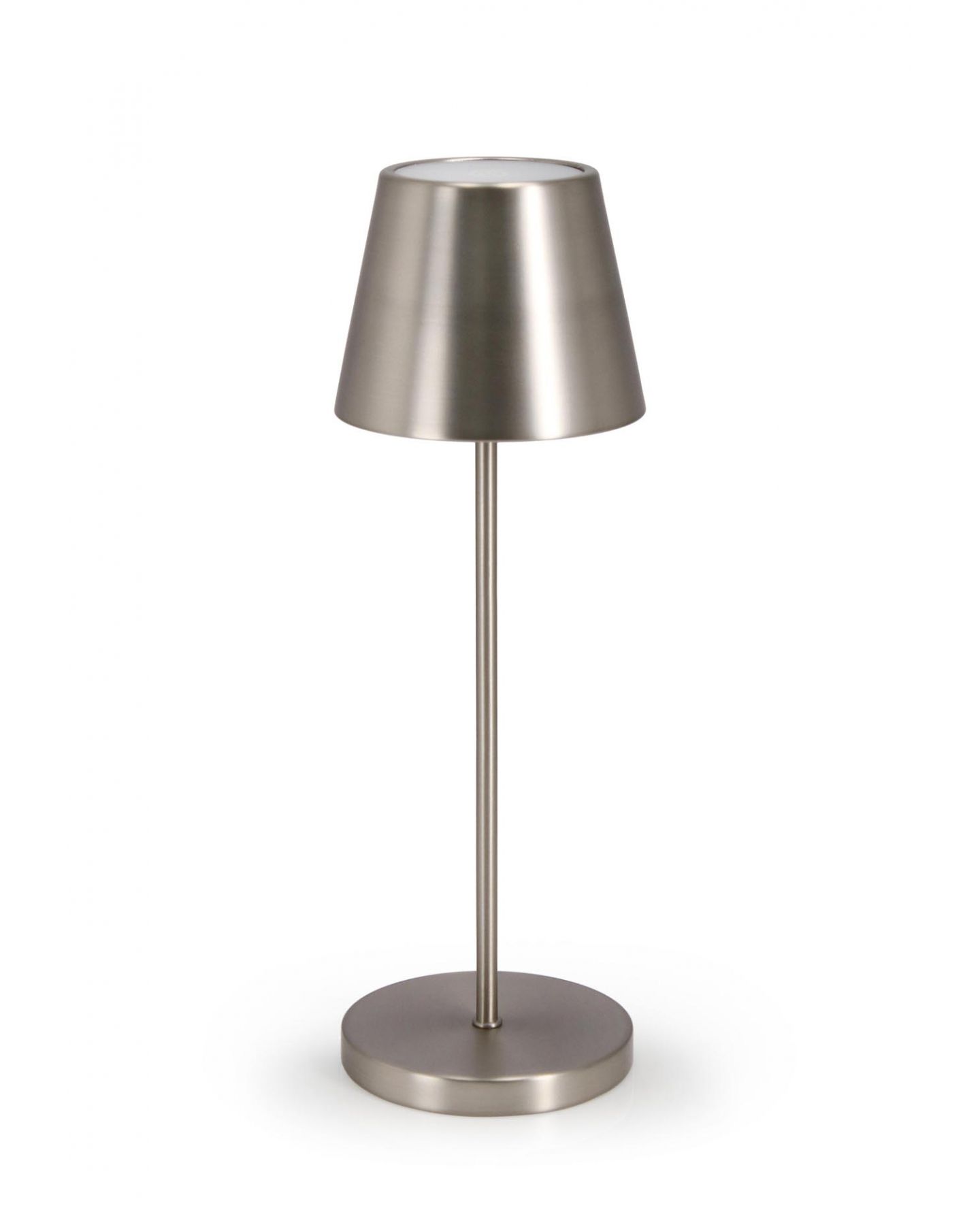 Lampe de table LED d'un style contemporain avec un abat-jour et pied en acier brossé, à utiliser aussi bien à l'intérieur qu’à l'extérieur en terrasse ou jardin.