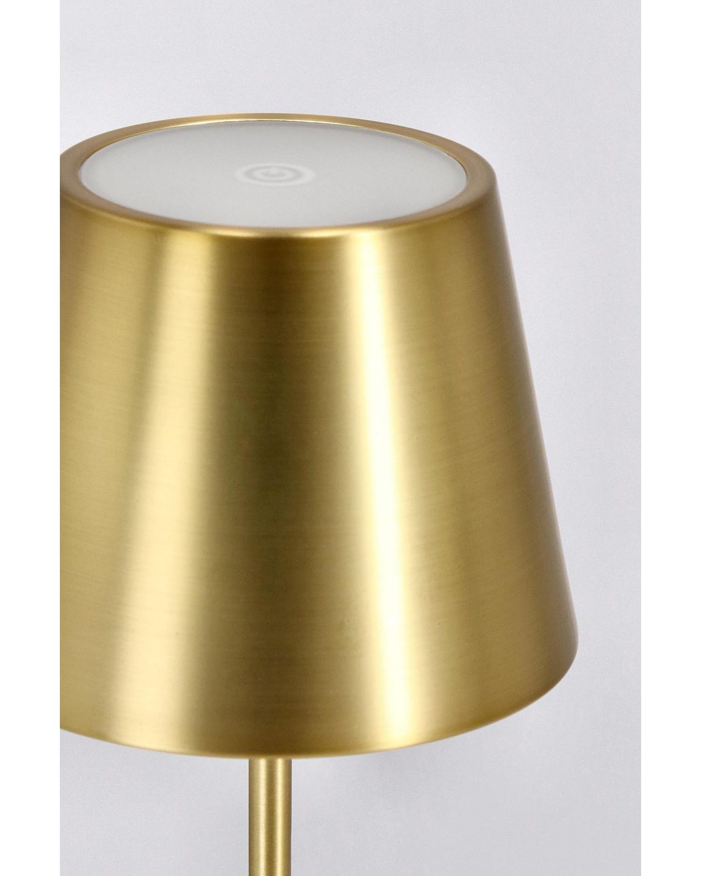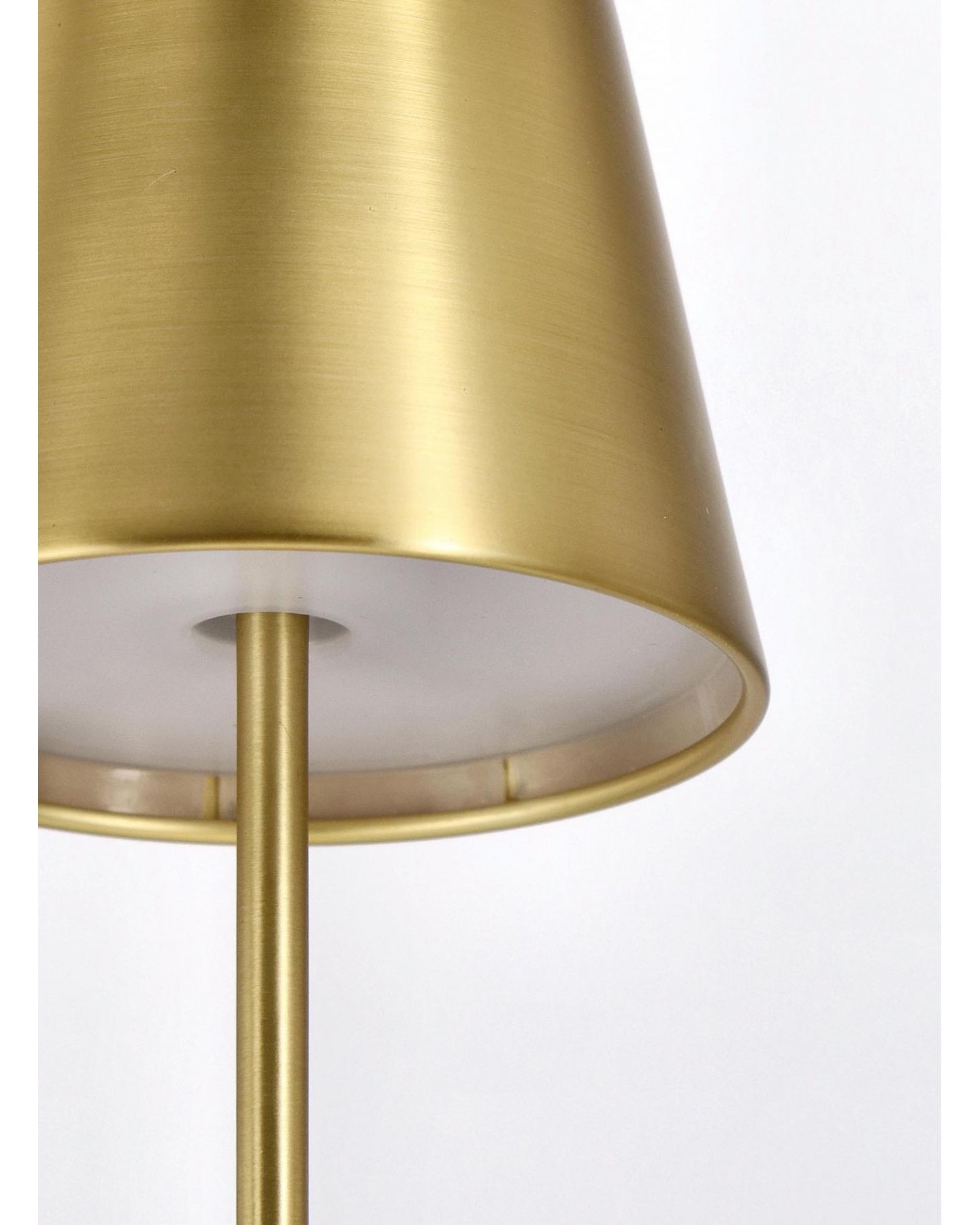 Lampe de table LED d'un style contemporain avec un abat-jour et pied en acier doré brossé, à utiliser aussi bien à l'intérieur qu’à l'extérieur en terrasse ou jardin.