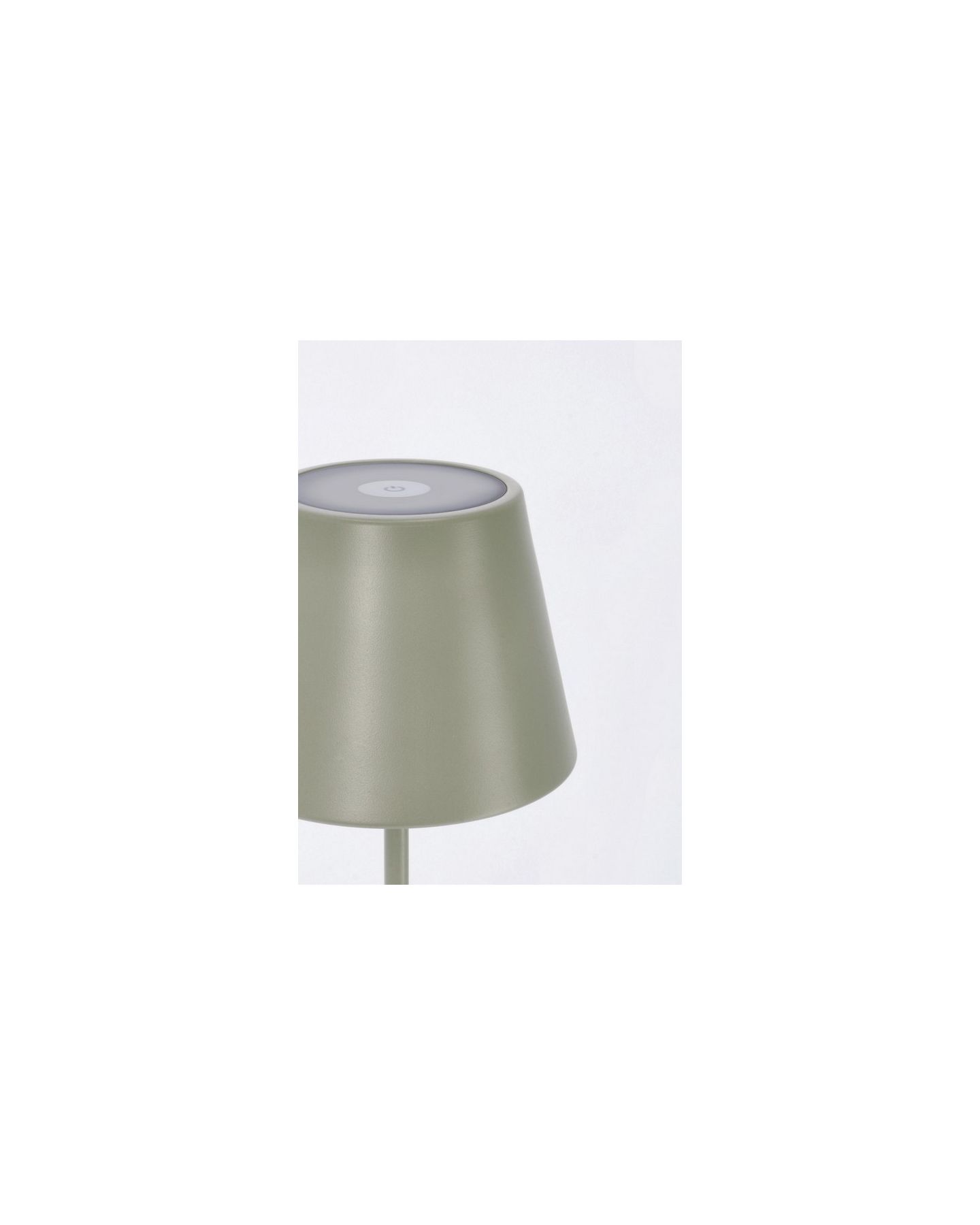 Lampe de table LED d'un style contemporain avec un abat-jour et pied en acier peint à poudre vert sauge mat, à utiliser aussi bien à l'intérieur qu’à l'extérieur en terrasse ou jardin.