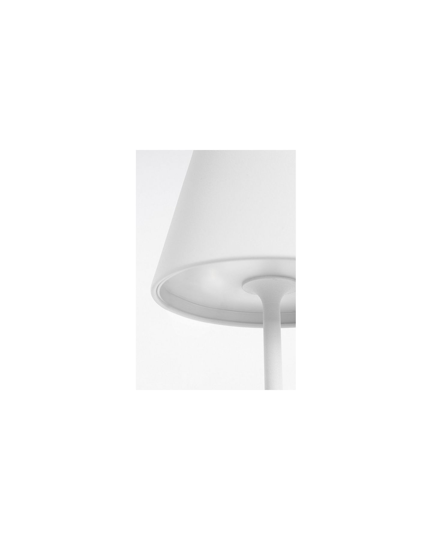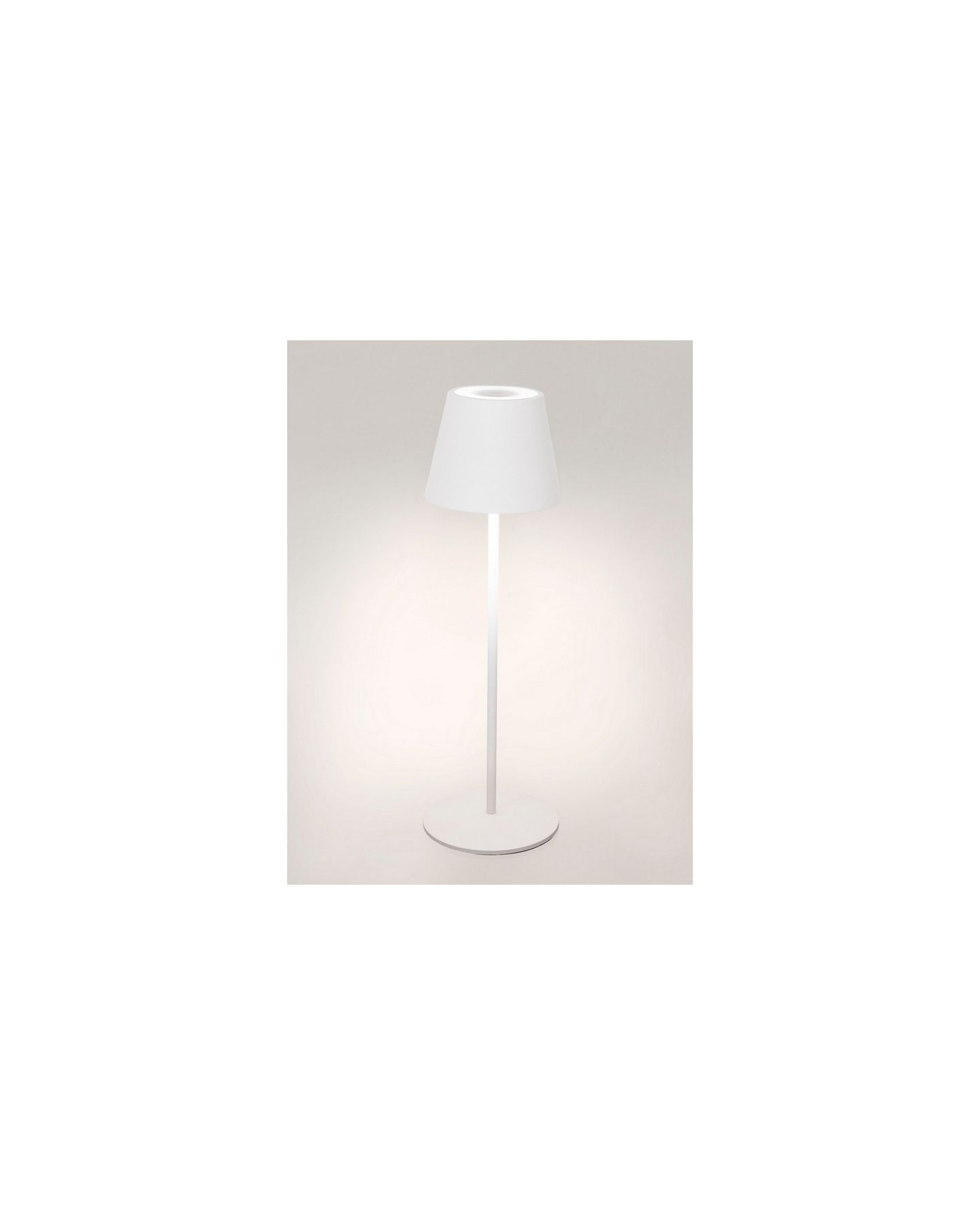 Lampe de table LED d'un style contemporain avec un abat-jour et pied en acier peint à poudre blanc mat, à utiliser aussi bien à l'intérieur qu’à l'extérieur en terrasse ou jardin.