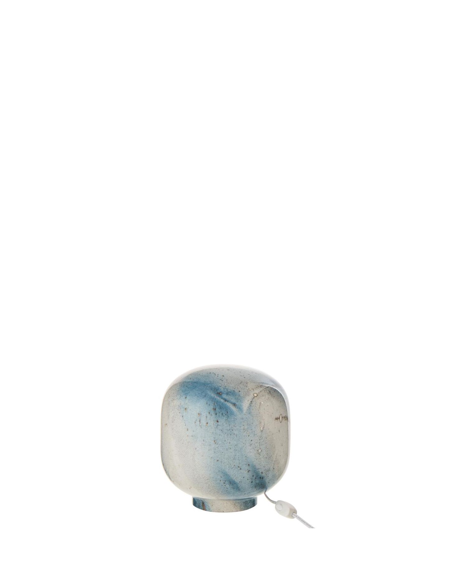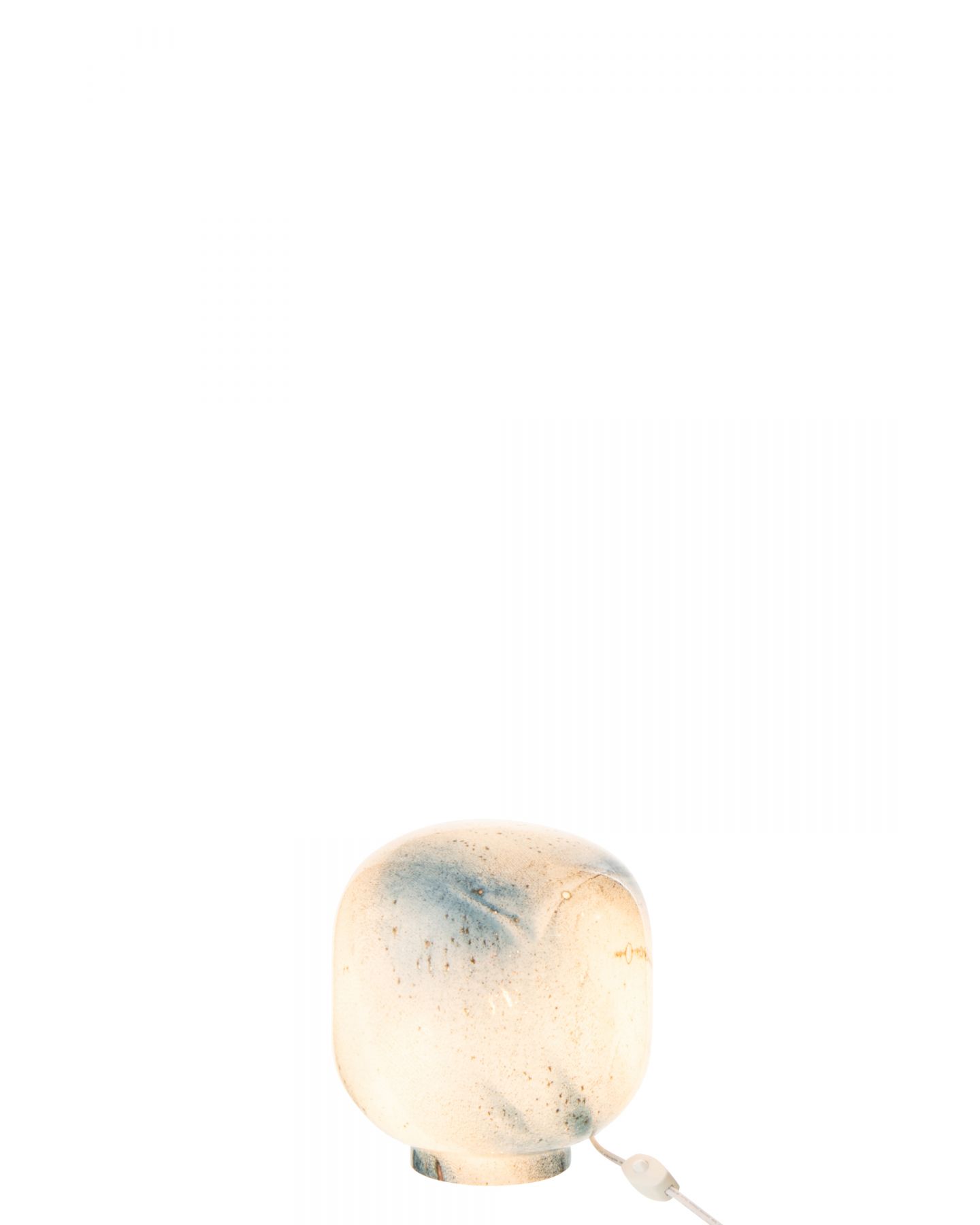 Lampe de table d'un style contemporain et forme ronde avec un abat-jour en verre bleu et blanc moucheté en forme de boule. Embout et cordon blanc. Ampoule disponible en magasin et dans la catégorie accessoire de luminaire.