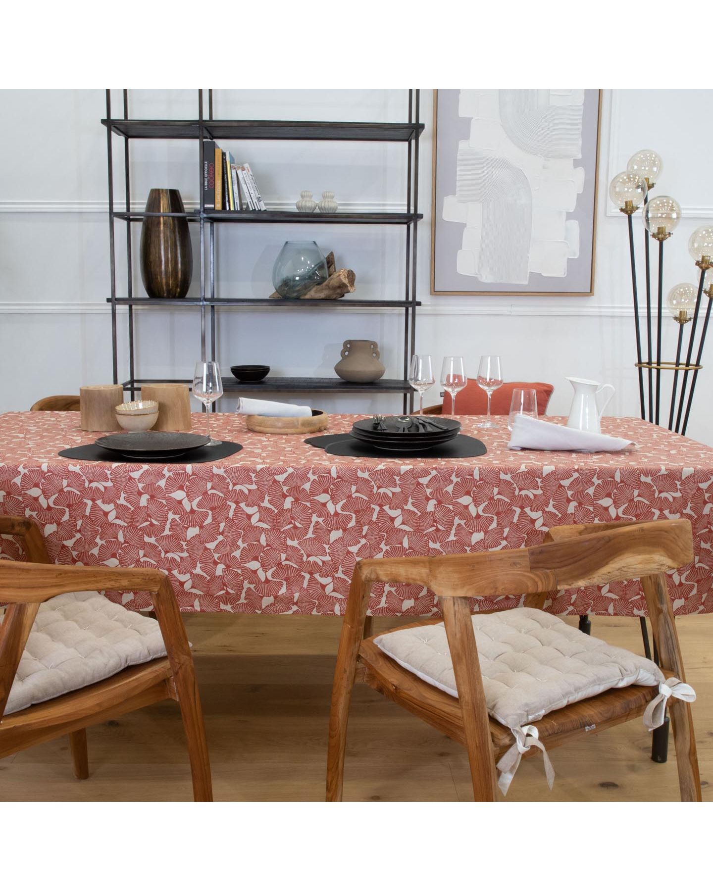Nappe carrée en coton enduit, c'est à dire plastifié, vous donnera envie de l'utiliser tout le temps avec ces petits motifs feuilles Ginkgo dans des coloris modernes. La nappe se lave à l'éponge mais peu aussi passer en machine de temps en temps à 30° mais sans adoucissant.