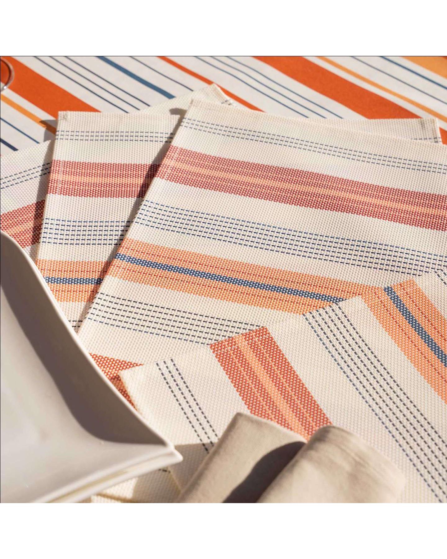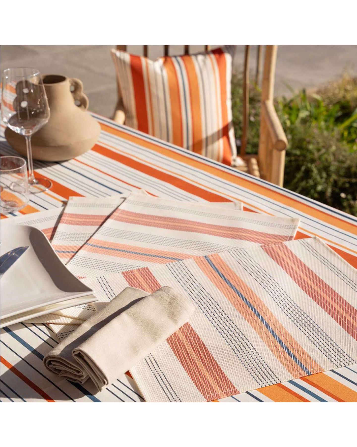 Set de table rectangulaire en polyester enduit, c'est à dire plastifié, vous donnera envie de l'utiliser tout le temps avec ces superbes motifs rayures dans des coloris modernes. Le set se lave à l'éponge mais peu aussi passer en machine de temps en temps à 30° mais sans adoucissant.