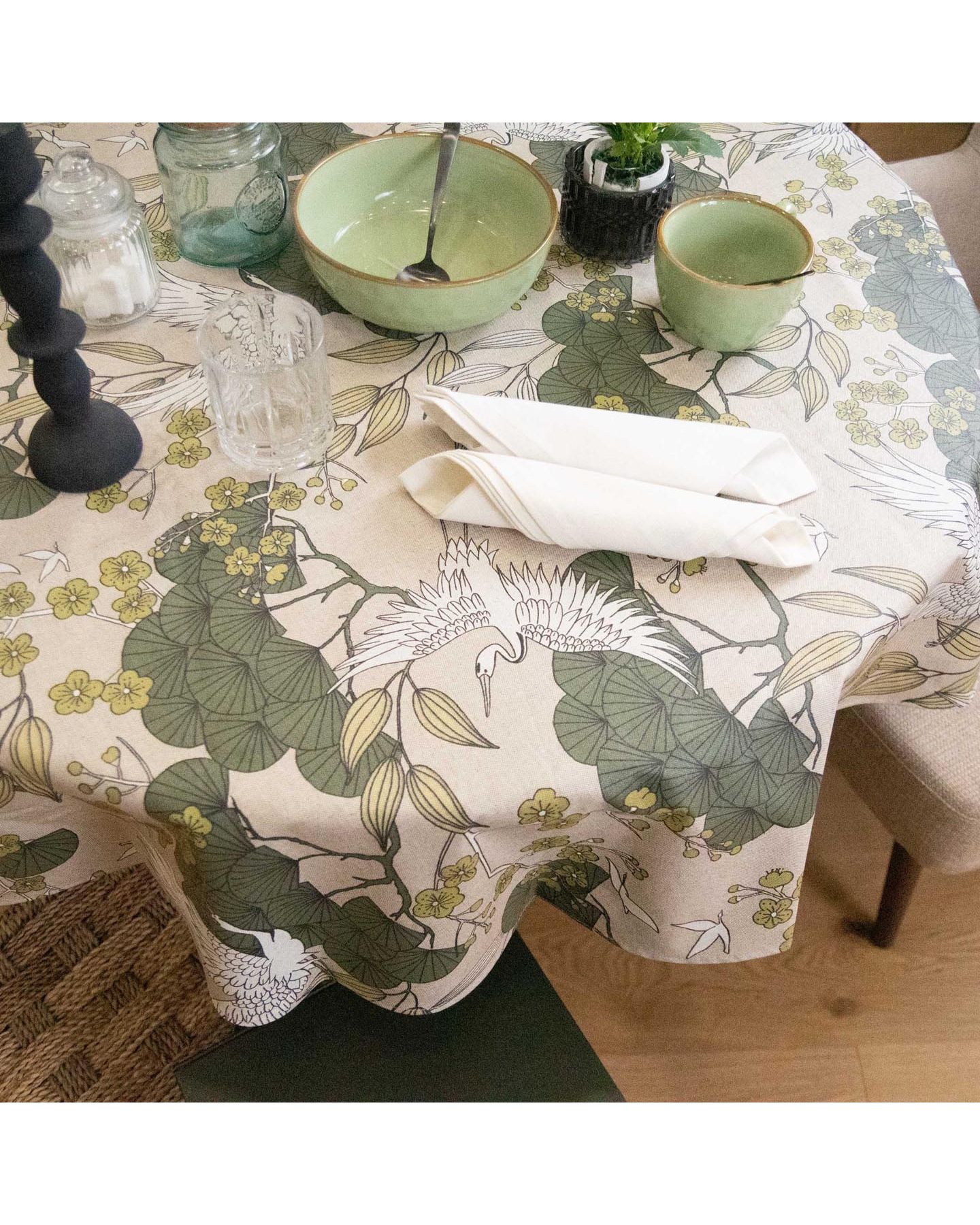 Nappe ronde en coton enduit, c'est à dire plastifié, vous donnera envie de l'utiliser tout le temps avec ces motifs japonisants dans des coloris modernes. Son design raffiné, inspiré des estampes nippones, mêle délicatement nature et géométrie. La nappe se lave à l'éponge mais peu aussi passer en machine de temps en temps à 30° mais sans adoucissant.