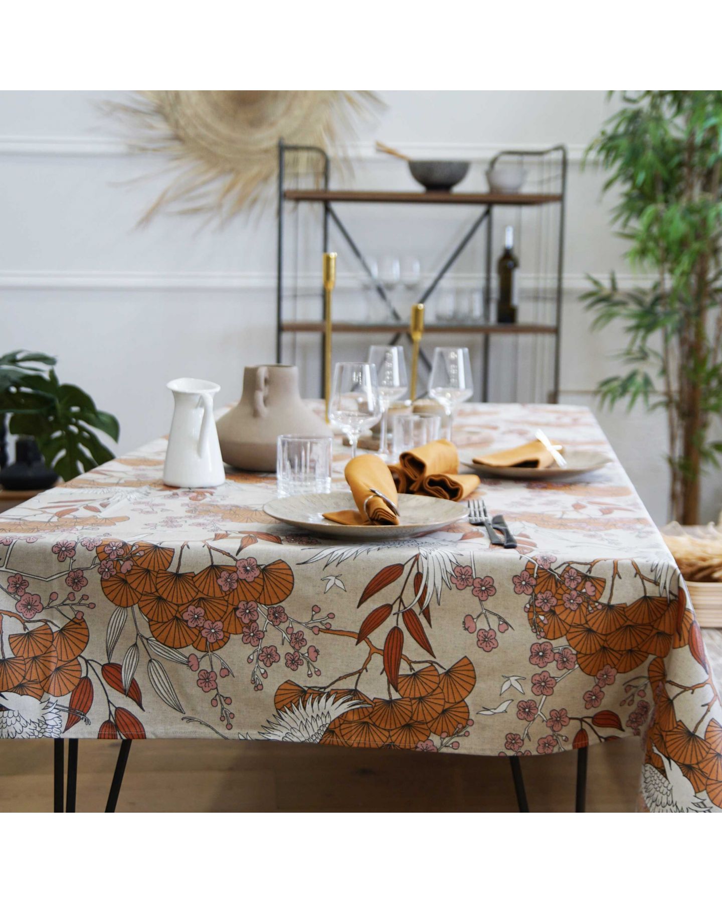 Nappe rectangulaire en coton enduit, c'est à dire plastifié, vous donnera envie de l'utiliser tout le temps avec ces motifs japonisants dans des coloris modernes. Son design raffiné, inspiré des estampes nippones, mêle délicatement nature et géométrie. La nappe se lave à l'éponge mais peu aussi passer en machine de temps en temps à 30° mais sans adoucissant.