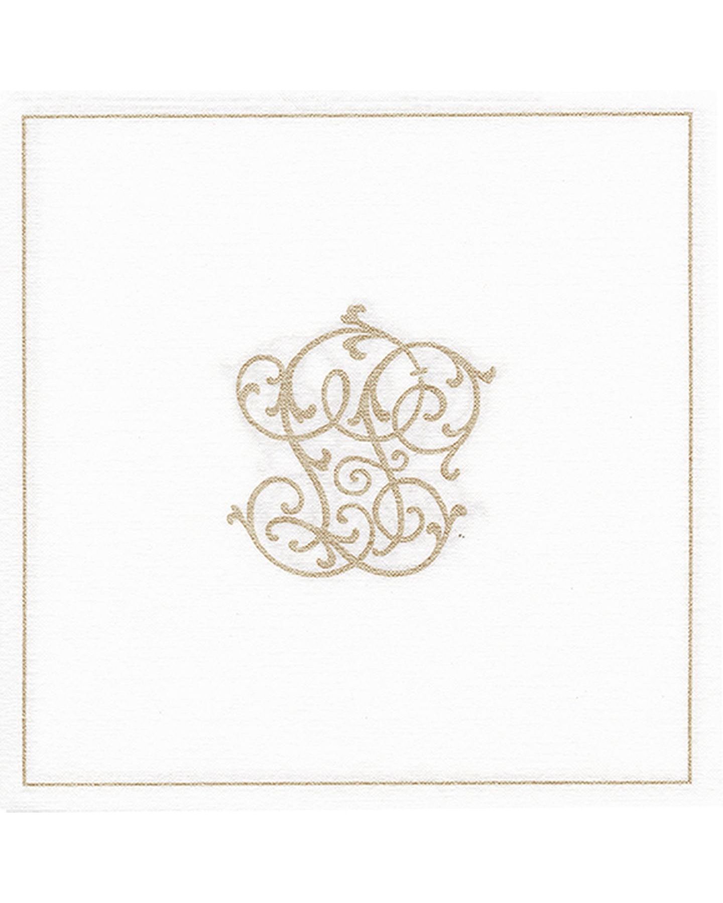 Un paquet de 20 serviettes cocktail jetables en intissé blanc orné d'un monogramme doré au centre pour une touche d'élégance à table.