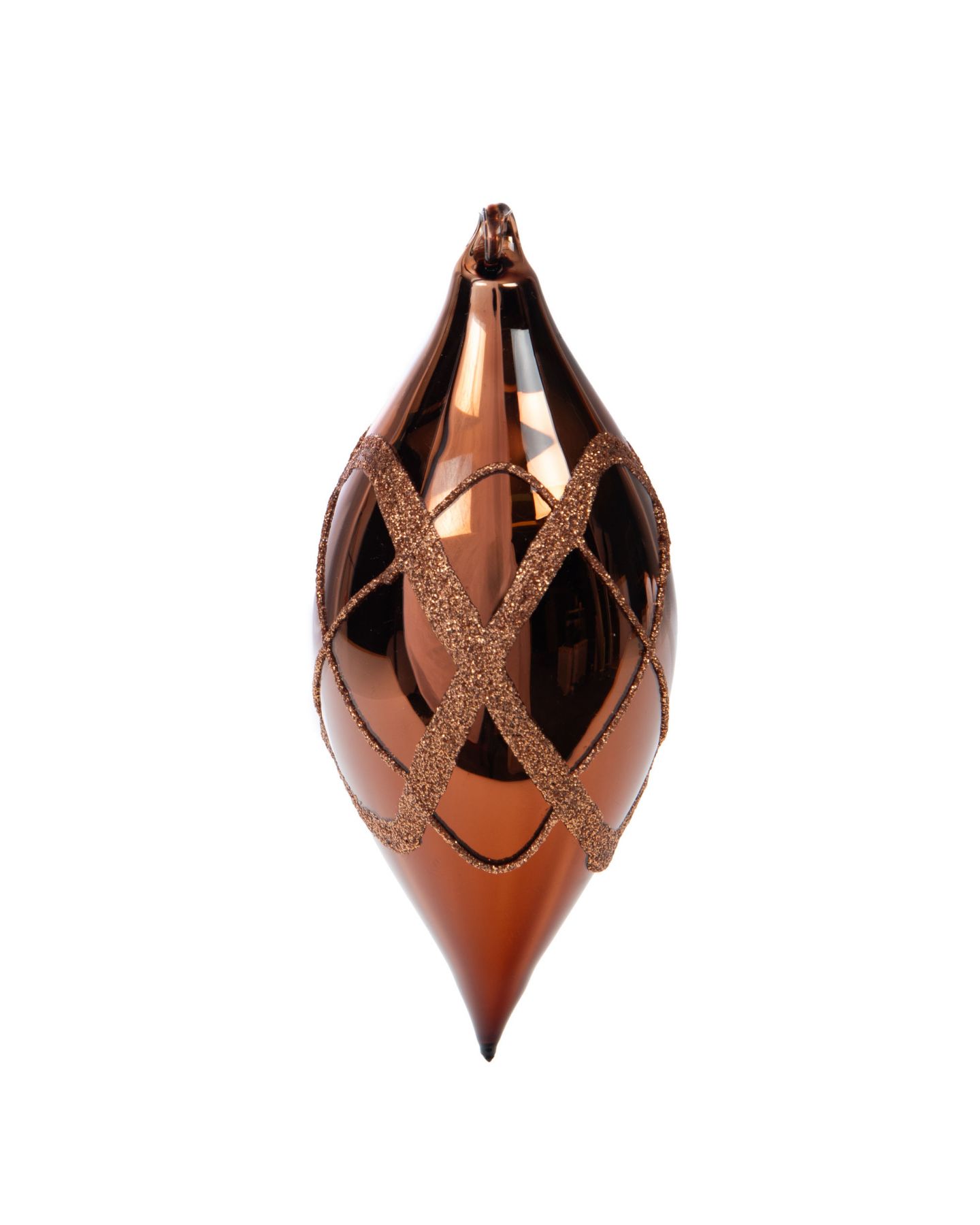Décoration en verre cuivré avec des motifs pailletés pour décorer votre sapin et votre intérieur en période festive.