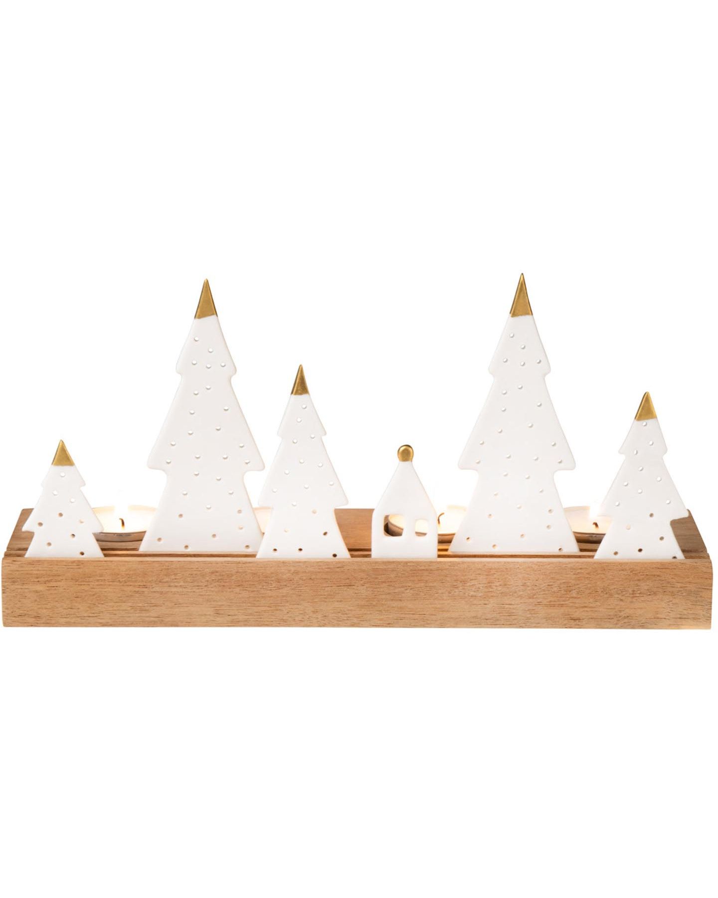 Des éléments en porcelaine fine blanc en forme de sapin avec des touches dorées insérés dans la base en bois d'acacia créent un merveilleux jeu d'ombre et de lumière.