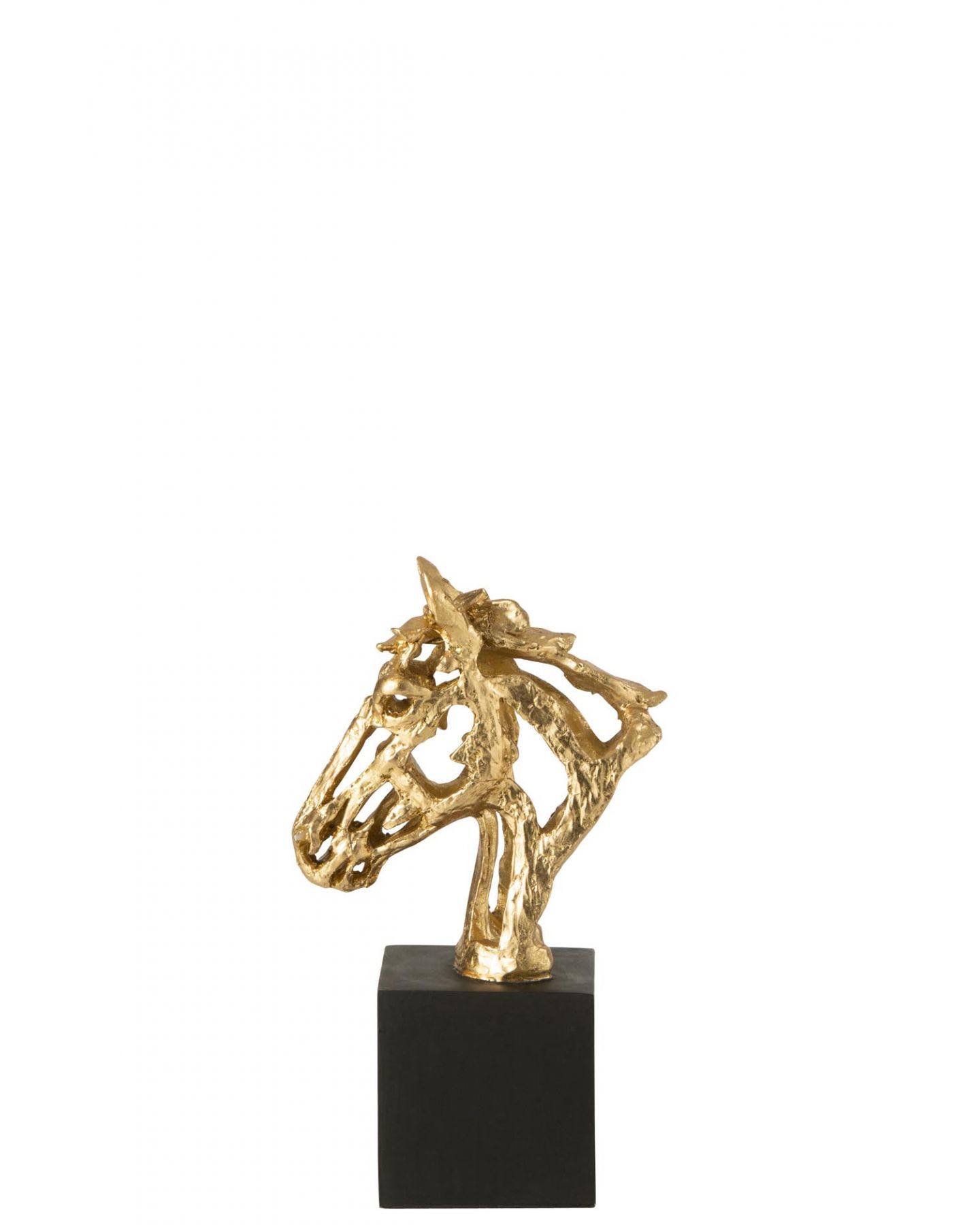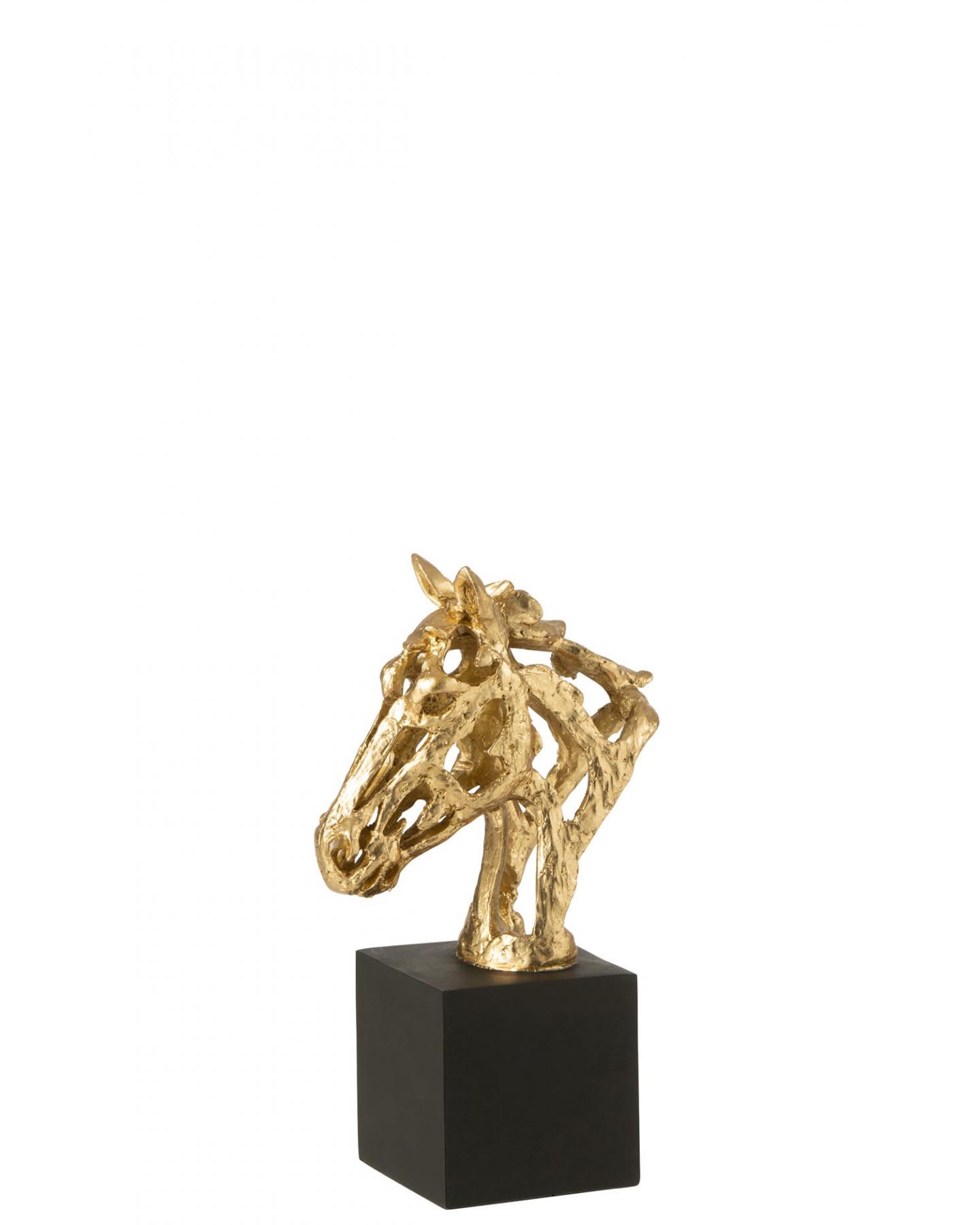 Ornement en forme d'une tête de cheval dorée, élégante et ajourée sur pied carré noir en résine de grande qualité pour mettre en valeur tous vos meubles. Le cadeau idéal !
