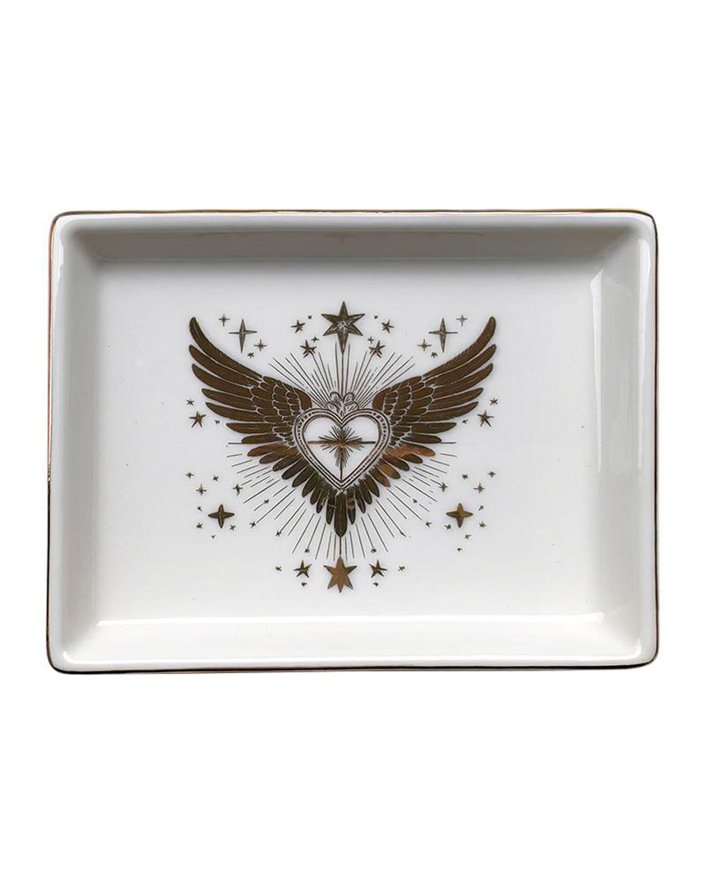 Vide-poche rectangulaire en céramique blanche ornée d'une clé aux ailes avec des accents dorés, un joli ornement bien pratique pour disposer tous vos objets précieux.