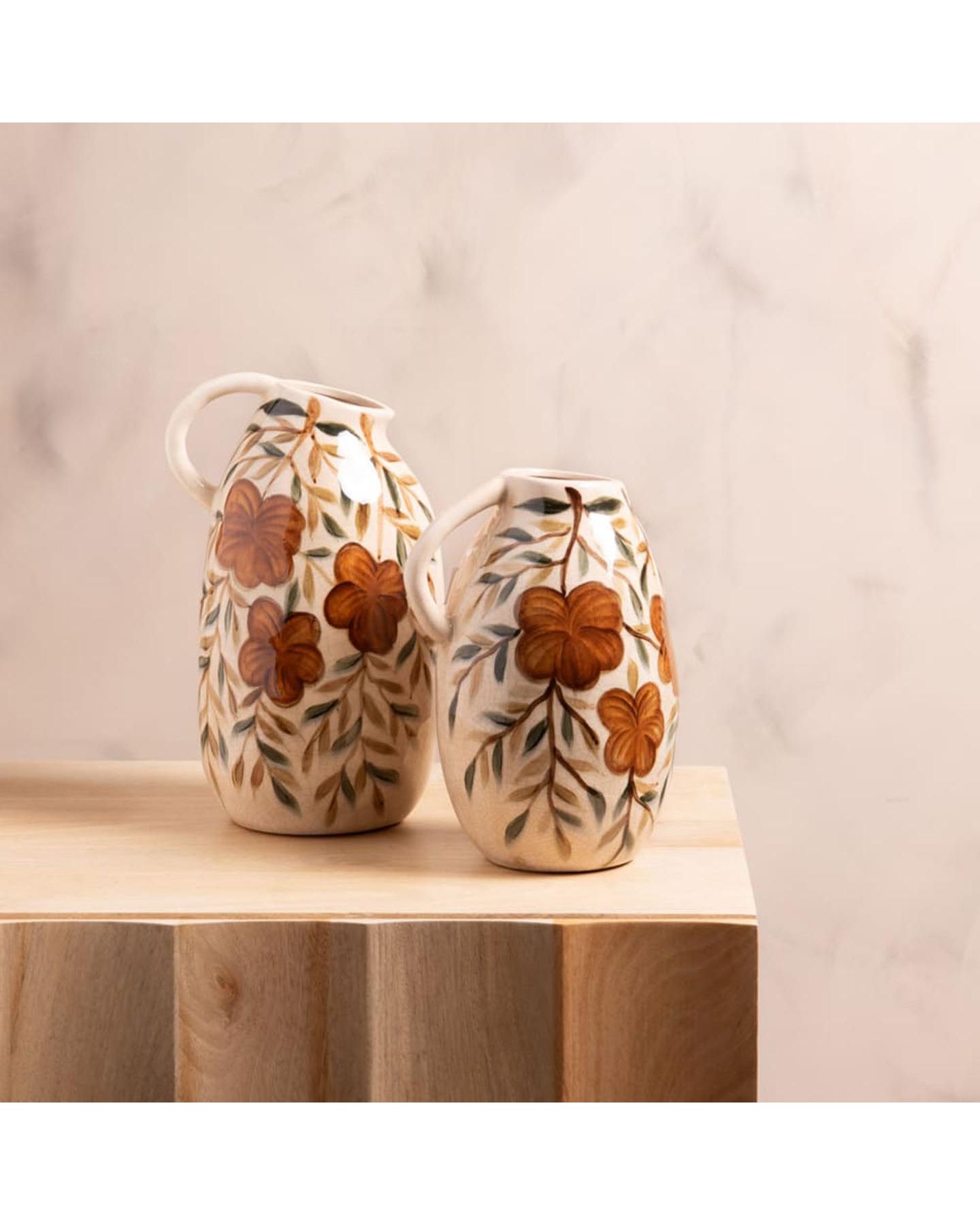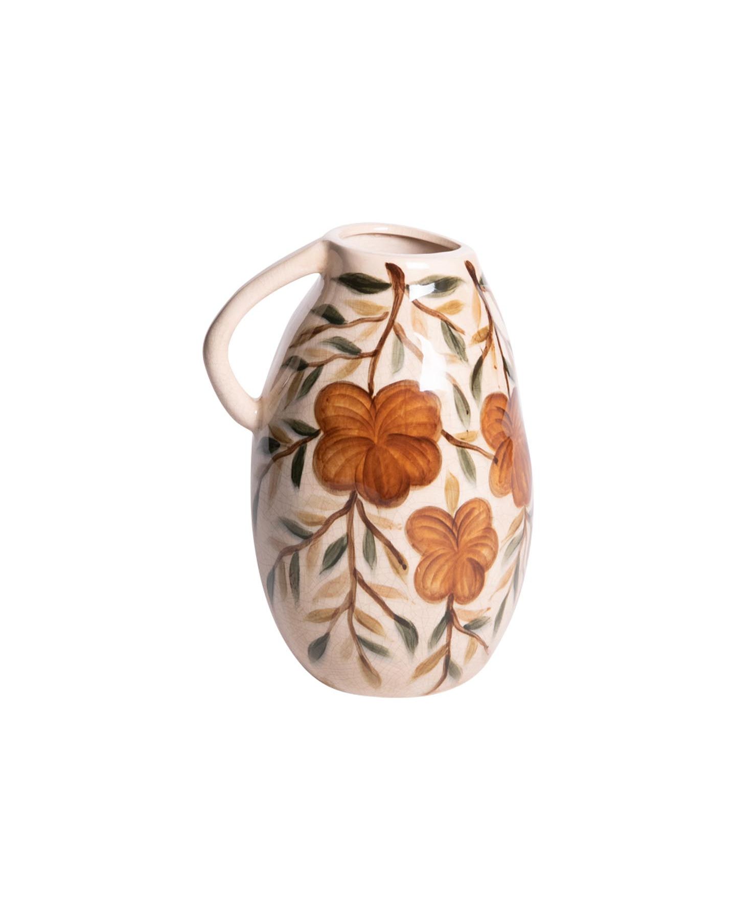 Jarre en céramique beige naturelle aux motifs floraux délicats aux nuances marron et vert. Son design naturel et ses couleurs harmonieuses en font un élément décoratif parfait pour valoriser bouquets, plantes ou simplement habiller un espace avec style.