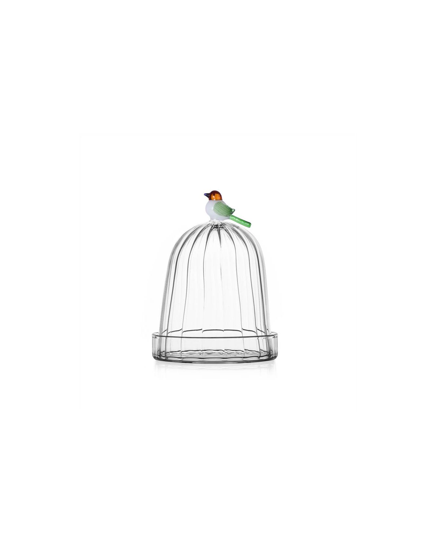 Petite cloche et plat en verre transparent avec un oiseau perché en haut pour mettre en valeur vos plus belles préparations, gâteaux et objets de valeur en toute élégance. Ce présentoir laissera apparaître vos préparations tout en les protégeant de l'air ambiant.
