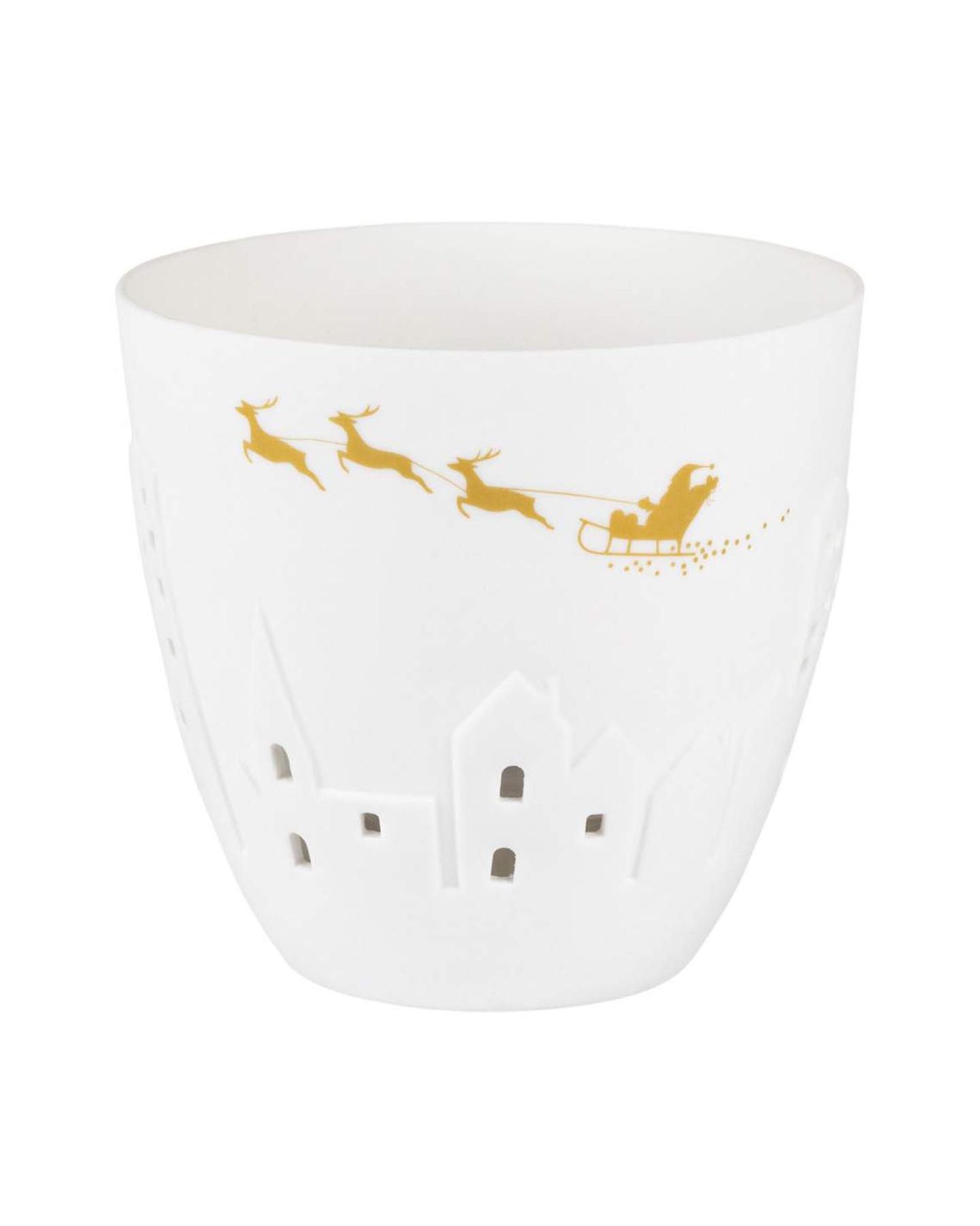 Ce photophore poétique en porcelaine blanc ultra-fine est réalisé à la main et diffuse une lueur de bougie particulièrement délicate. Le motif en filigrane doré d'un renard en paysage hivernal évoque le confort sur chaque table et vous invite à rêver.