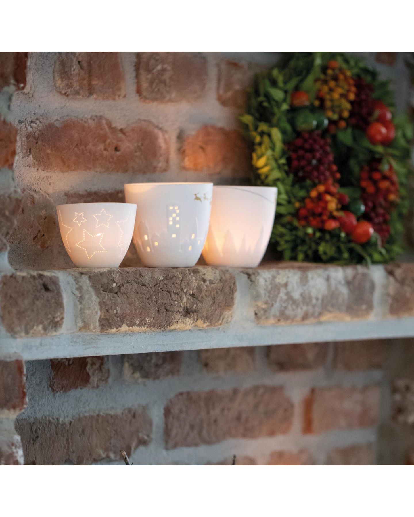 Ce photophore poétique en porcelaine blanc ultra-fine est réalisé à la main et diffuse une lueur de bougie particulièrement délicate. Le motif en filigrane doré d'un renard en paysage hivernal évoque le confort sur chaque table et vous invite à rêver.
