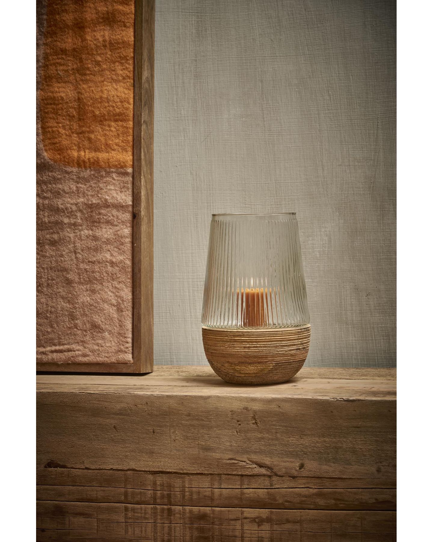 Vase rond décoratif en verre cannelé transparent avec une base en bois de manguier naturel pour apporter une touche élégante à votre décoration. Pour mettre en valeur un bouquet, utiliser comme magnifique photophore ou à disposer comme simple objet de décoration.