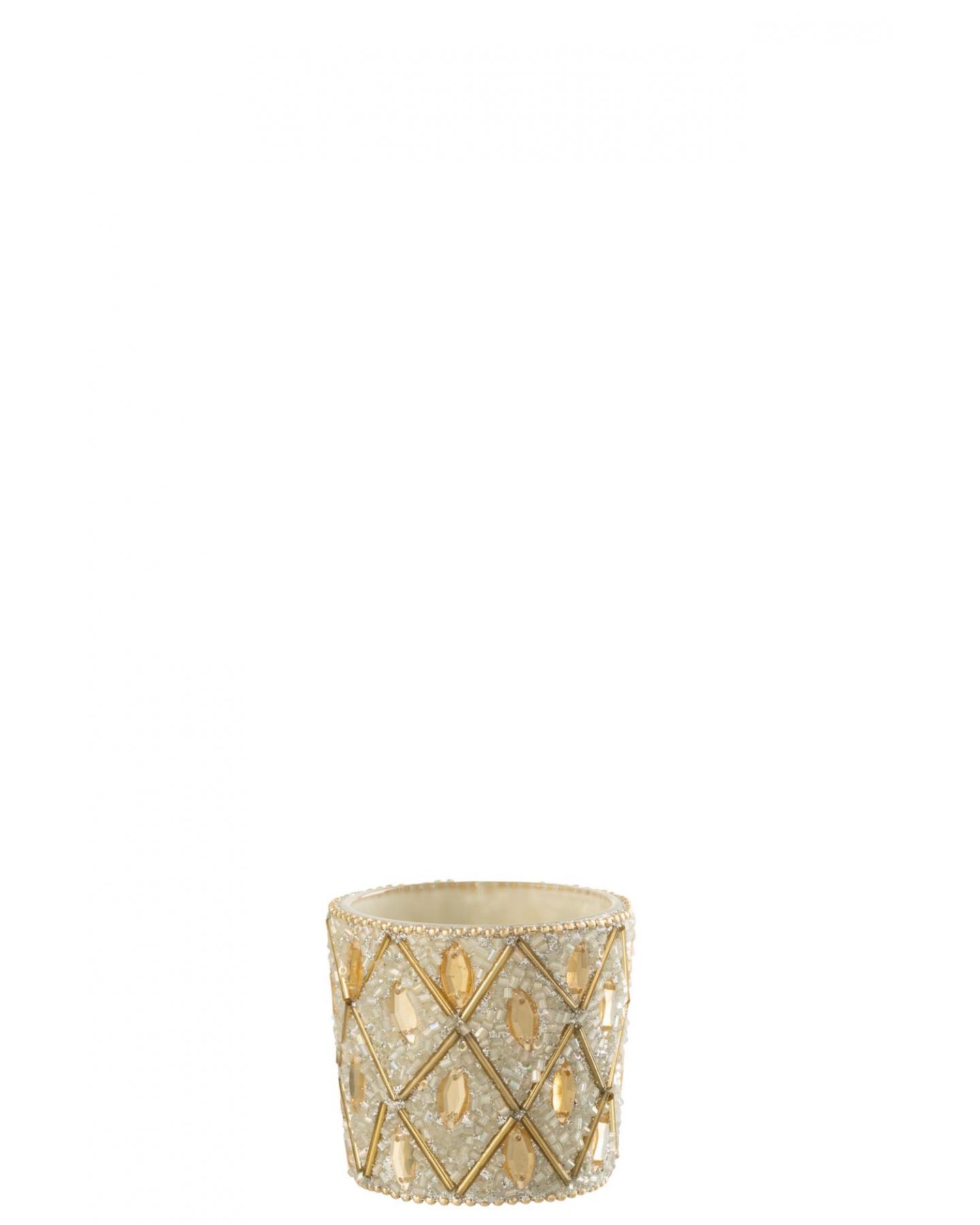 Photophore en verre doré orné des perles avec un intérieur doré pour une lumière douce et une ambiance romantique. A compléter avec une bougie chauffe-plat ou bougie classique disponible en magasin et bientôt sur notre site.