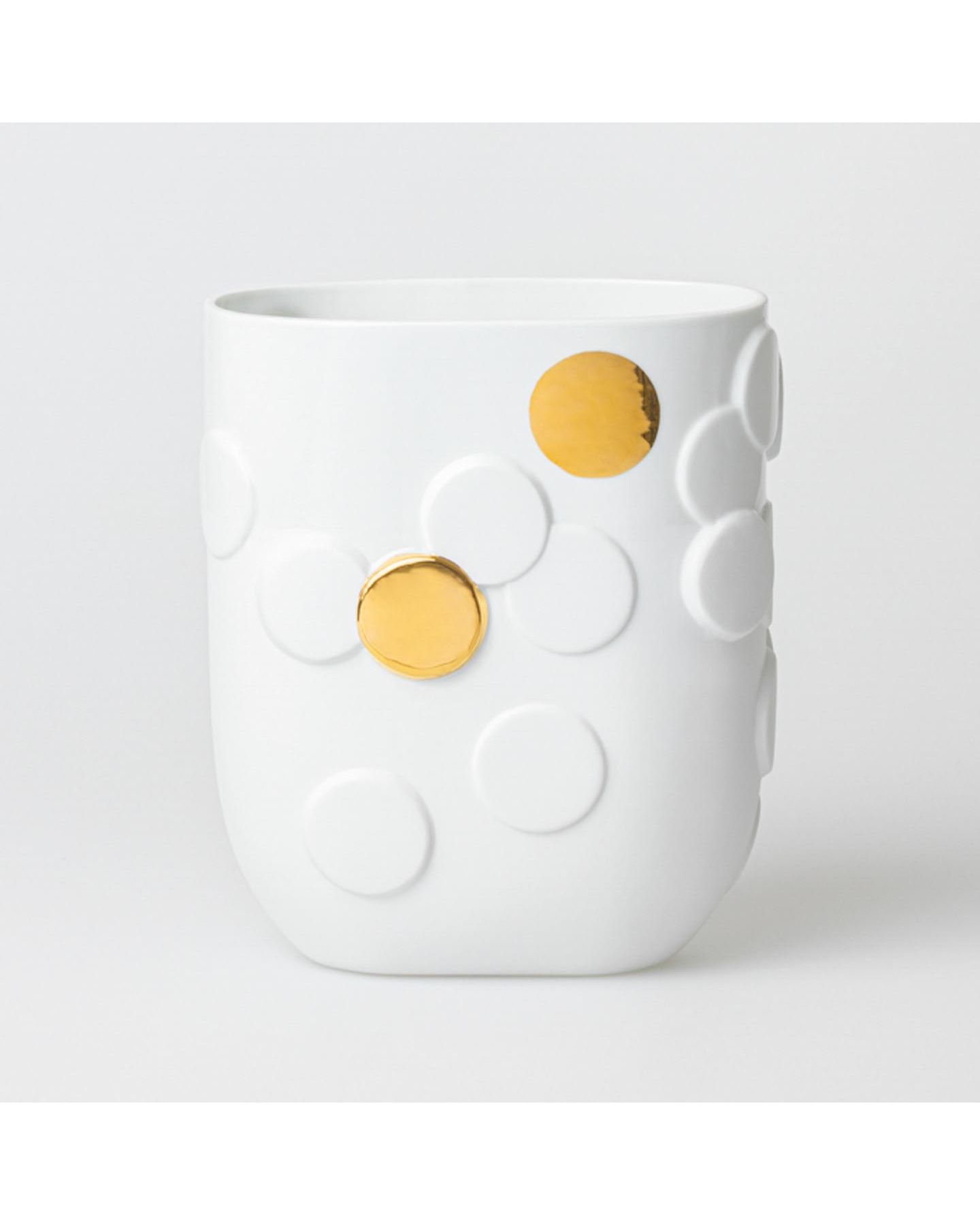Vase en porcelaine blanche ultra-fine aux motifs ronds en relief et dorés d'un style élégant et contemporain. Réalisé à la main et émaillé à l'intérieur, ce vase vous invite à rêver pendant la saison hivernale. Parfait pour mettre en valeur un bouquet ou à disposer comme simple objet de décoration.
